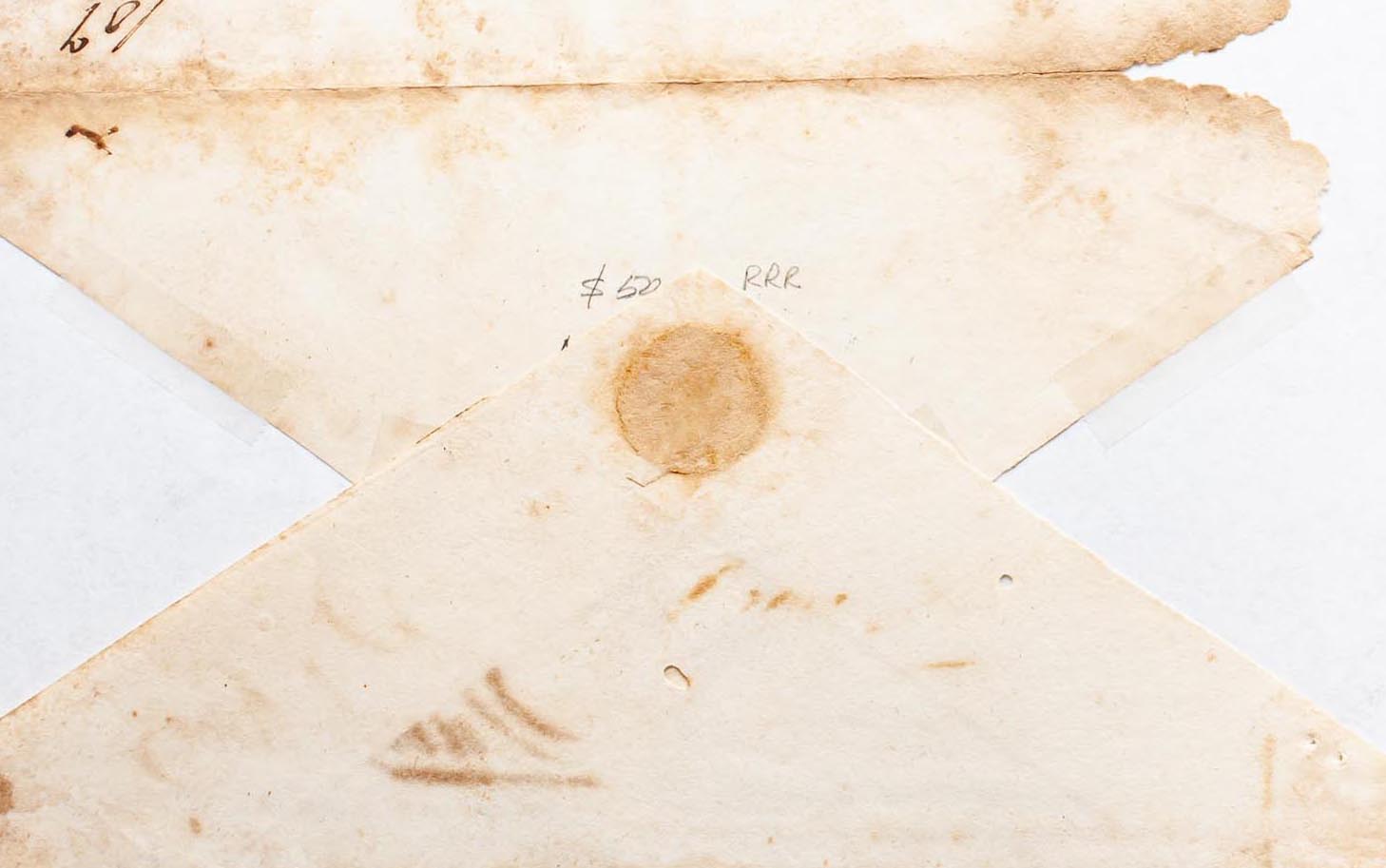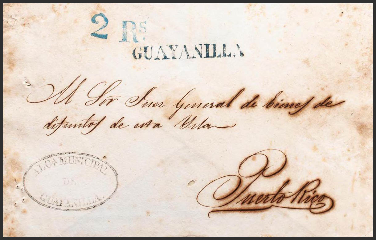 (1850ca). GUAYANILLA to SAN JUAN. GUAYANILLA brand, in blue (PE1) 2004 edition and bearing "2 Rs" (reales). MAGNIFICENT AND RARE. Ex-Acevedo.