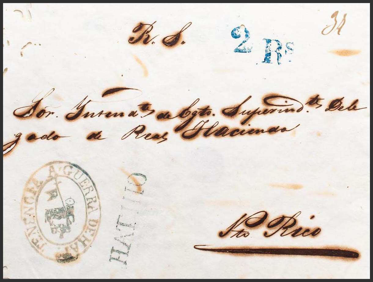 (1850ca). HATILLO to SAN JUAN. HATILLO brand, in blue-black. MAGNIFICENT AND EXTRAORDINARY RARE, NOT REVIEWED IN TIZON'S WORK AND NO MORE THAN THREE KNOWN.