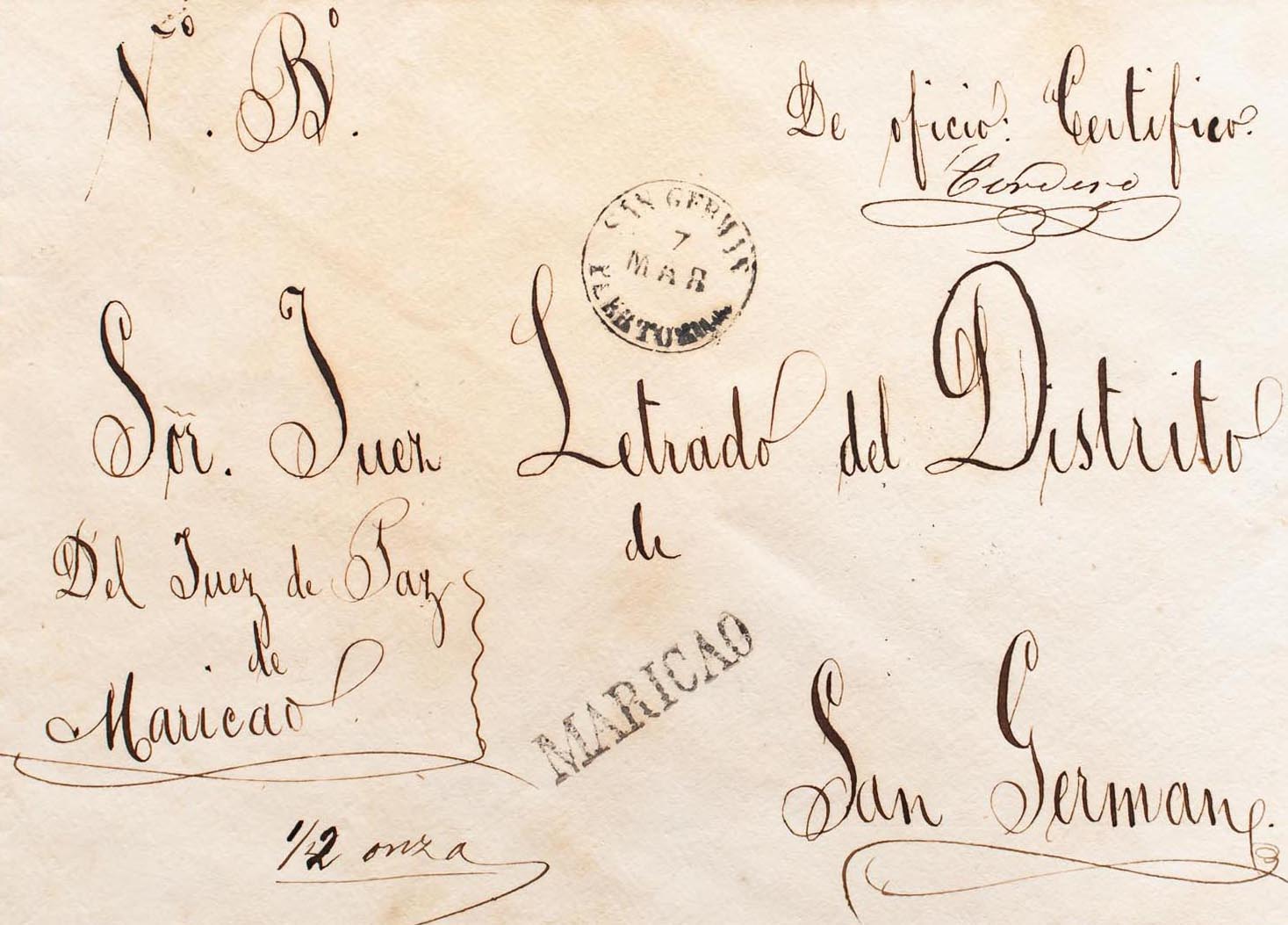 (1852ca). MARICAO to SAN GERMAN. MARICAO (PE1) 2004 edition mark and SAN GERMAN / PUERTO RICO dater. MAGNIFICENT AND EXTRAORDINARY RARE, NO MORE THAN TWO KNOWN. Ex-Acevedo.