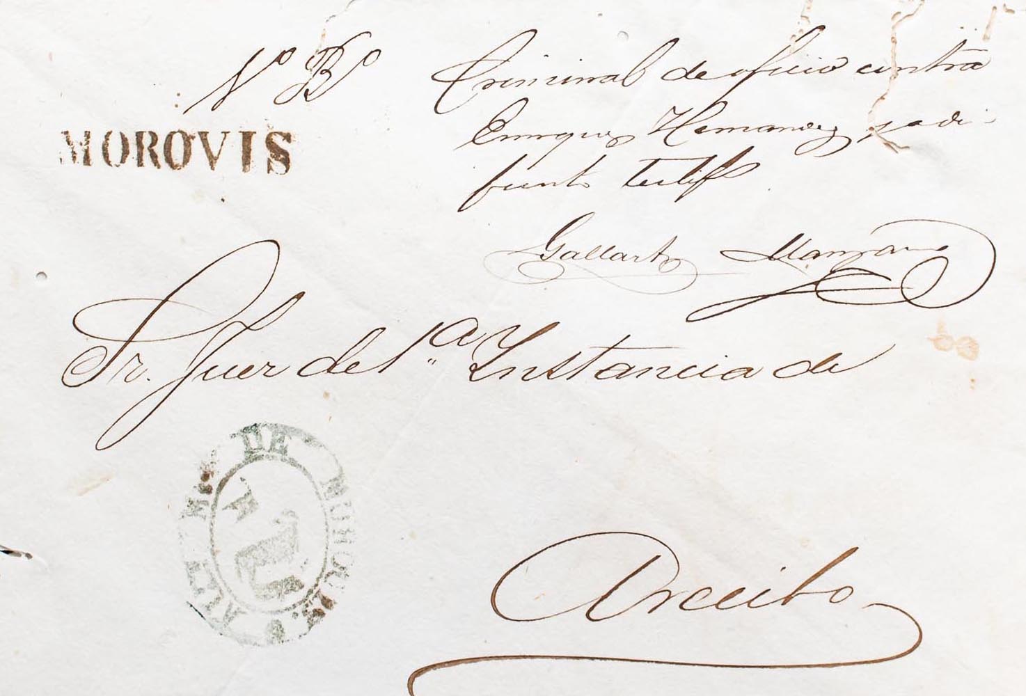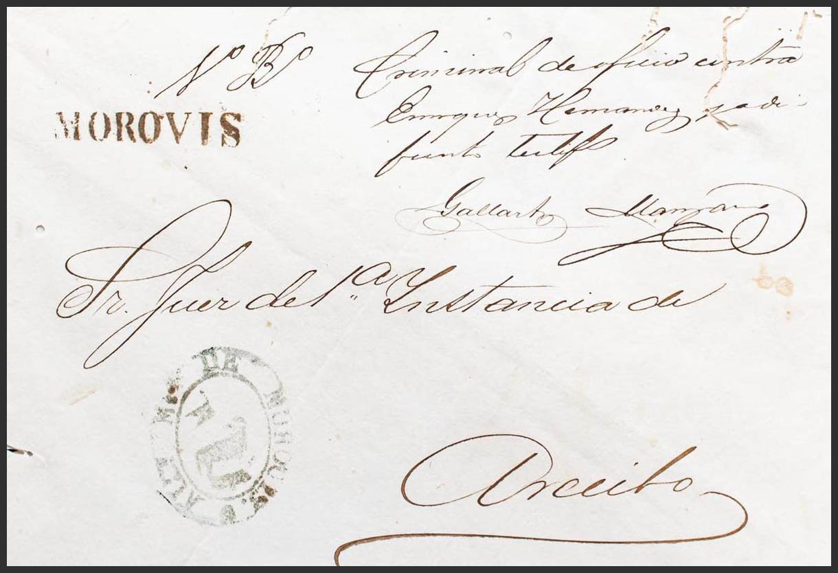 (1850ca). MOROVIS to ARECIBO (some usual erosion, of little importance). MOROVIS brand, in black (PE1) edition 2004. MAGNIFICENT AND VERY RARE. Ex-Acevedo.