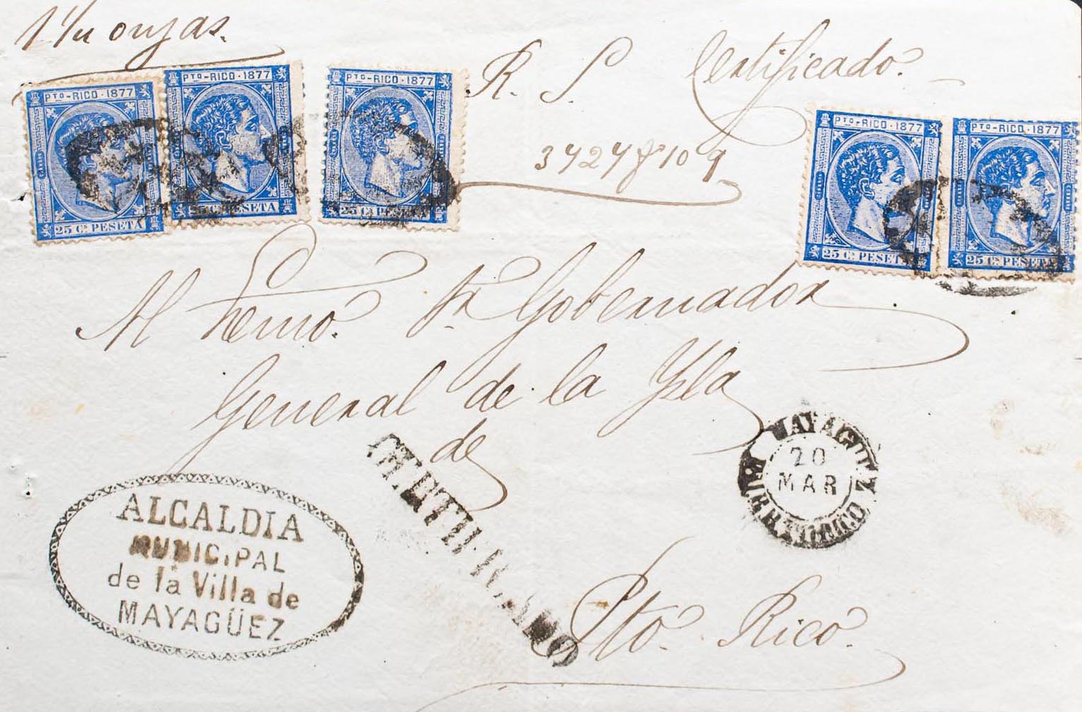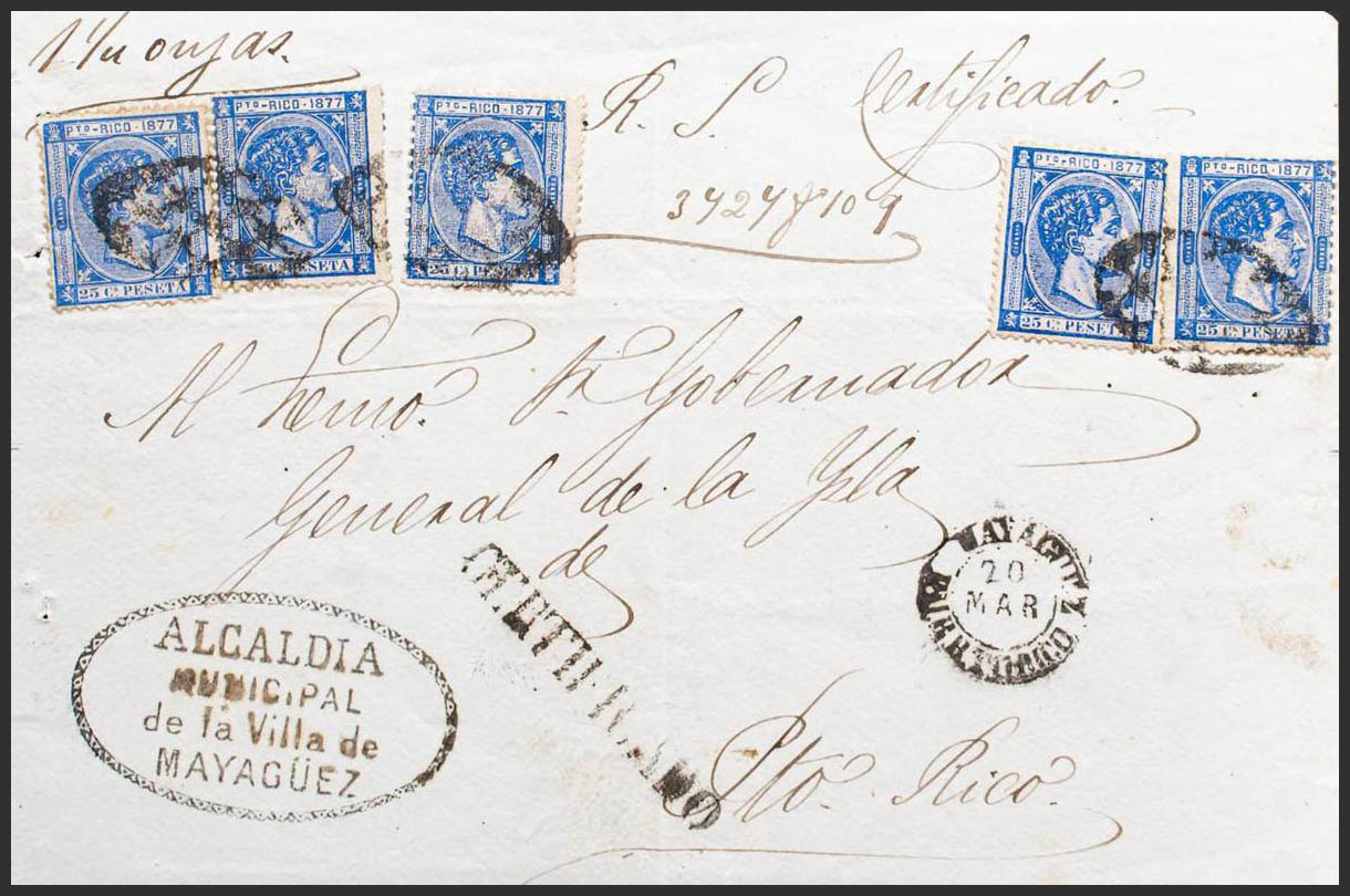 16(5). (1877ca). 25 cts overseas, five stamps. Certificate Front from MAYAGÜEZ to SAN JUAN. On the front linear mark CERTIFICATE. MAGNIFICENT.