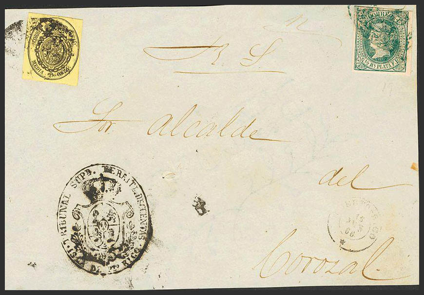 Ant. 10, Cuba 6. 1866. 1/2 real green, ON WHITE PAPER and 1/2 ounce yellow. Judicial Escrow from SAN JUAN DE PUERTO-RICO to COROZAL. MAGNIFICENT AND RARE MIXED POSTAGE. Ex-Gaspar Roca.