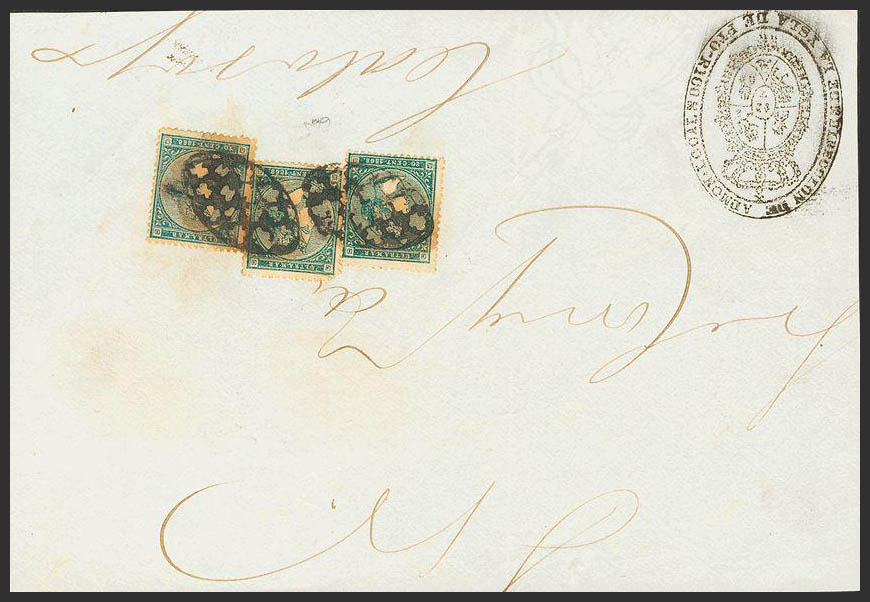 English Ant 13, 14(2). (1868ca). 10 cts blue and 20 cts green, two stamps. Judicial Escrow from SAN JUAN DE PUERTO-RICO to CABO-ROJO. MAGNIFICENT AND RARE TWO-COLOUR POSTAGE. Ex-Gaspar Roca.