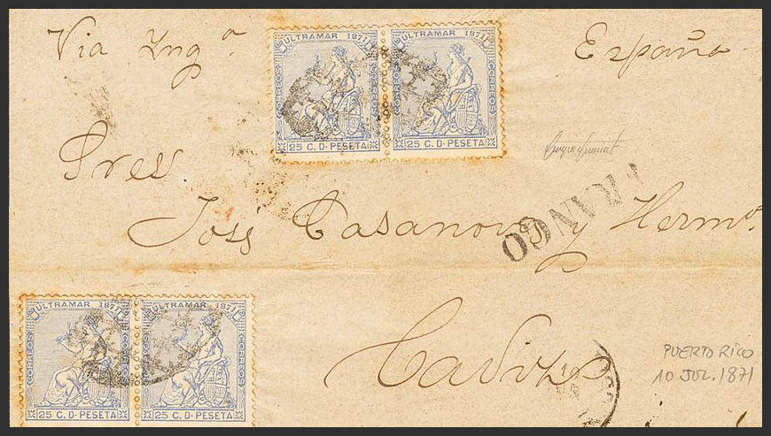 English Ant 22(4). 1872. 25 blue cts, two pairs. SAN JUAN DE PUERTO-RICO to CADIZ. On the front brand FRANCO. MAGNIFICENT AND RARE. Certificate SISMONDO. Ex-Gaspar Roca.