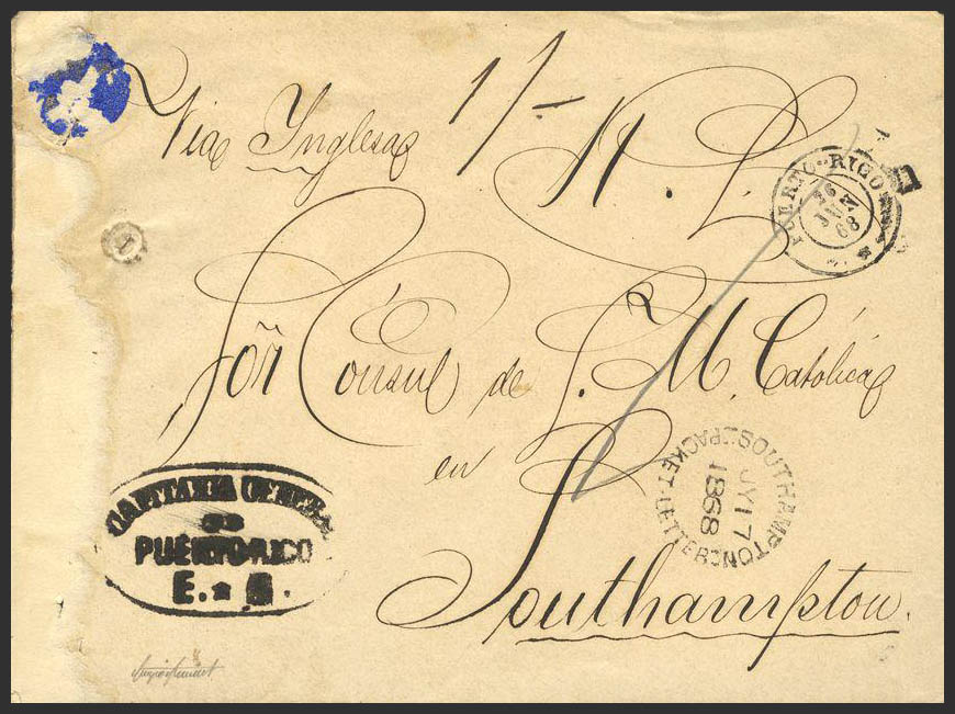 1868. SAN JUAN DE PUERTO-RICO to SOUTHAMPTON. Trademark CAPITANIA GENERAL / OF PUERTO-RICO / E*M. MAGNIFICENT. Certificate SISMONDO. Ex-Gaspar Roca.