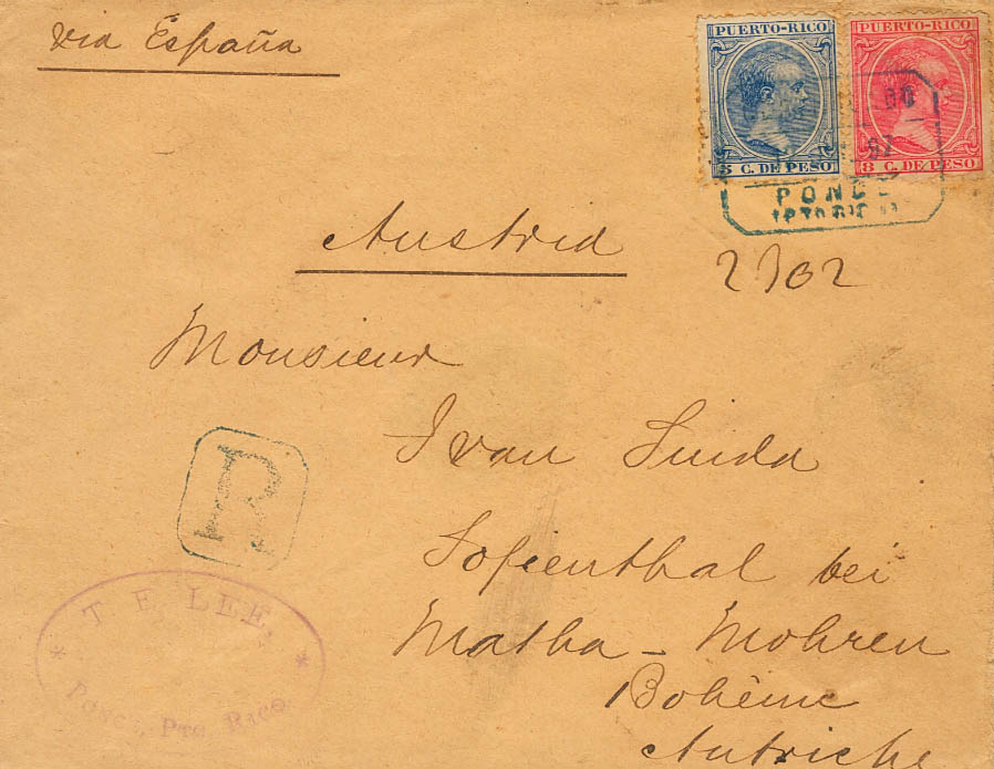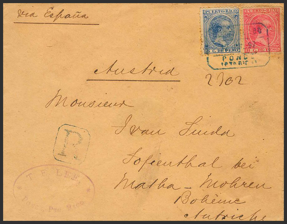 124, 126. 1891. 5 cents blue and 8 cents pink. Certificate from PONCE to SOFIENTHAL (AUSTRIA). CERTIFIED postmark / PONCE / (PTO RICO), in blue, on arrival back. MAGNIFICENT AND VERY RARE.