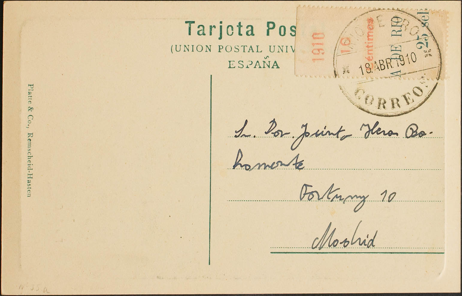 55MP. 1910. 10 cts red on edge of sheet. Postcard from RIO DE ORO to MADRID. Postmark RIO DE ORO / CORREOS, arrival on the back. MAGNIFICENT.