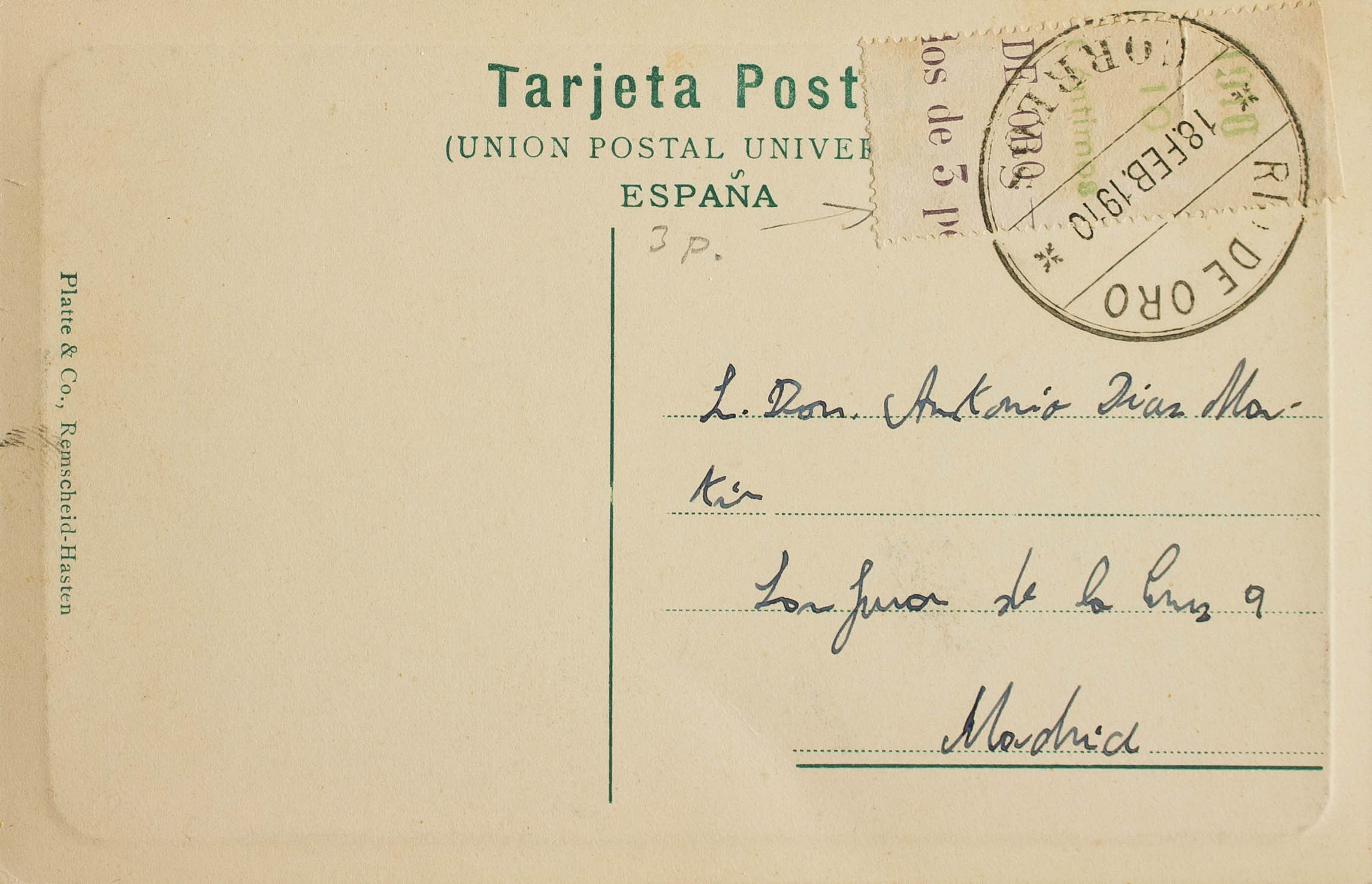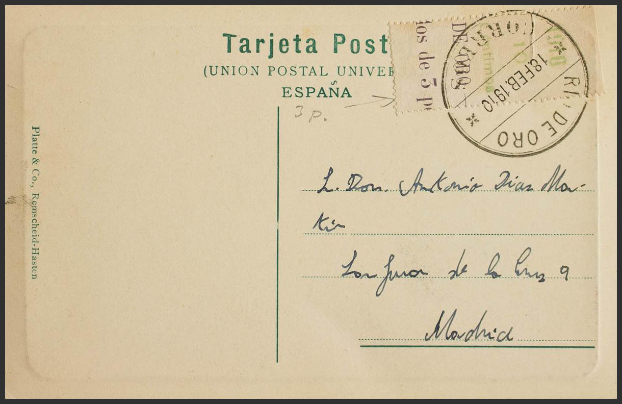 English 56MP. 1910. 10 cts green on leaf edge. Postcard from RIO DE ORO to MADRID. Postmark RIO DE ORO / CORREOS, arrival on the back. MAGNIFICENT.