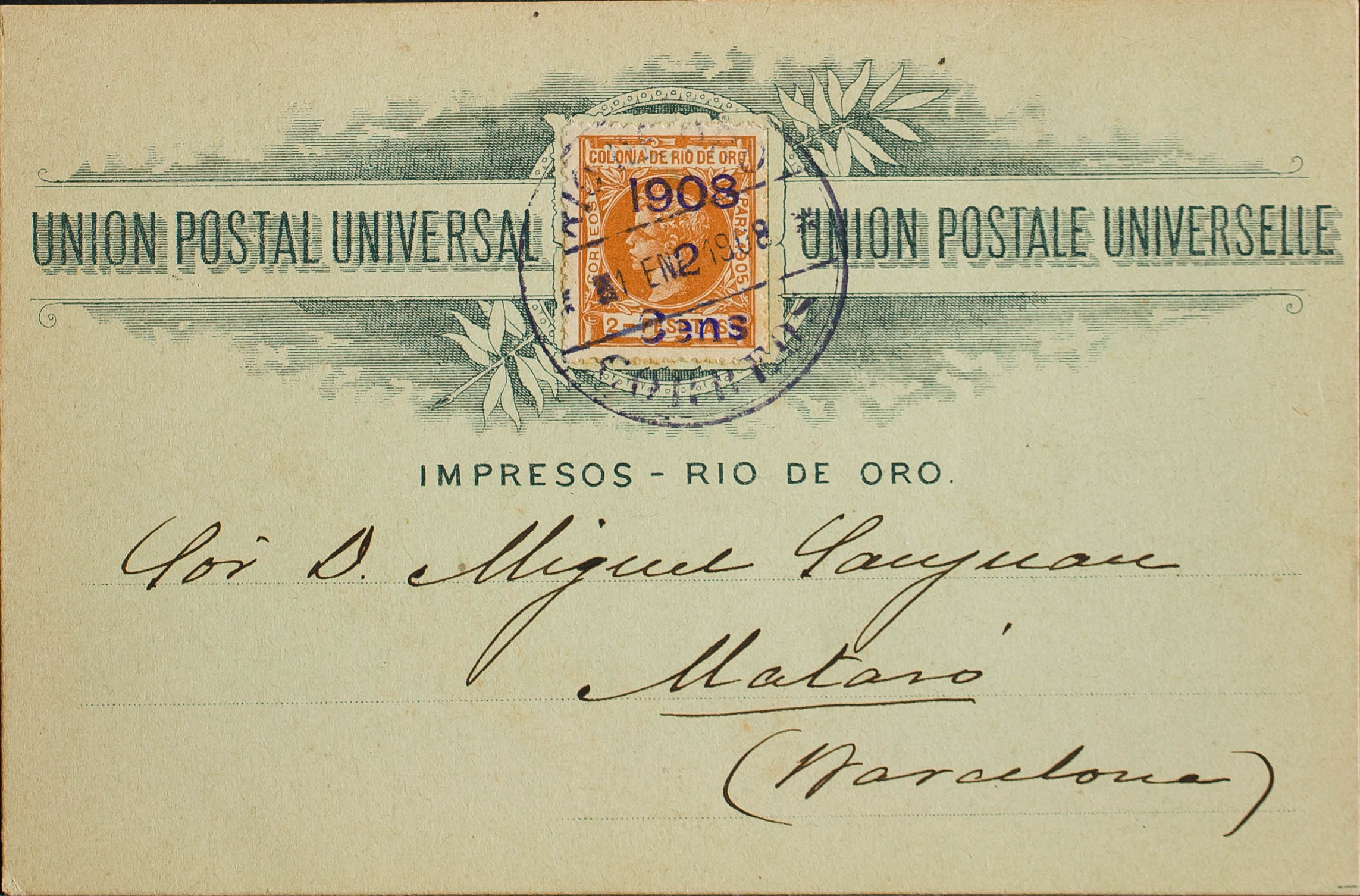 34. 1908. 2 cts over 2 orange sts. Postcard of the CATALAN PHILATELIC SOCIETY from RIO DE ORO to MATARO. Postmark RIO DE ORO / CORREOS, in violet. MAGNIFICENT AND RARE. Edifil 2013: 290 Euros