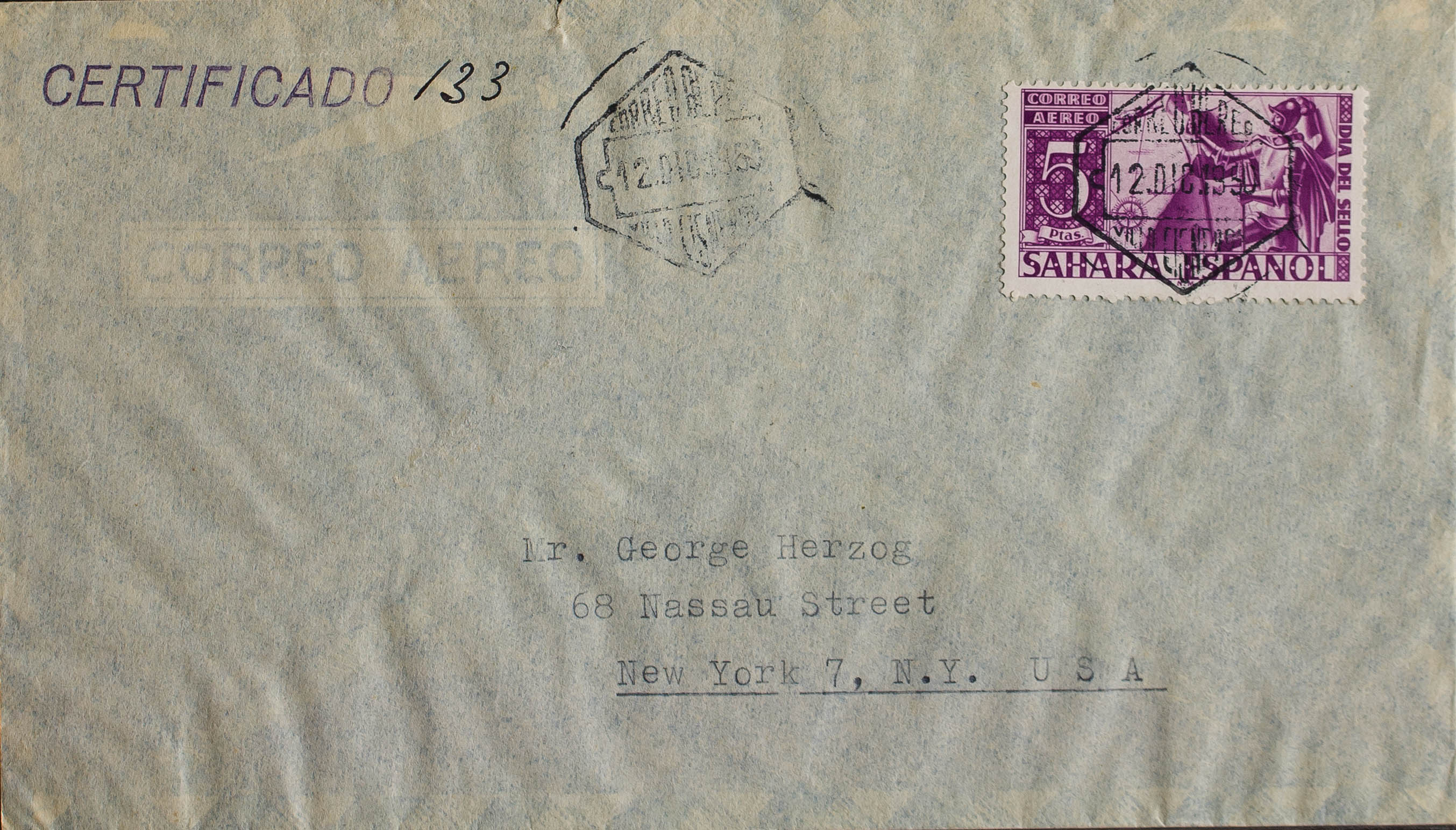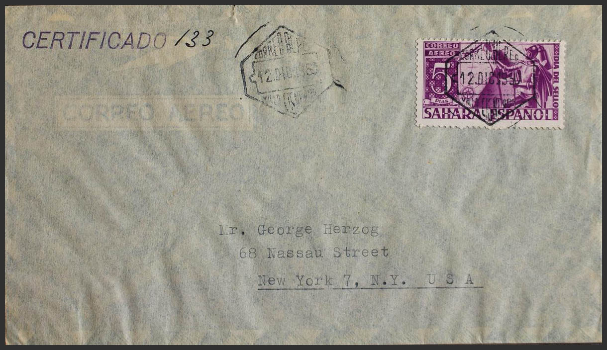 865. 1950. 5 pts purple. Certificate from VILLACISNEROS to NEW YORK (USA). On the back arrival. MAGNIFICENT.