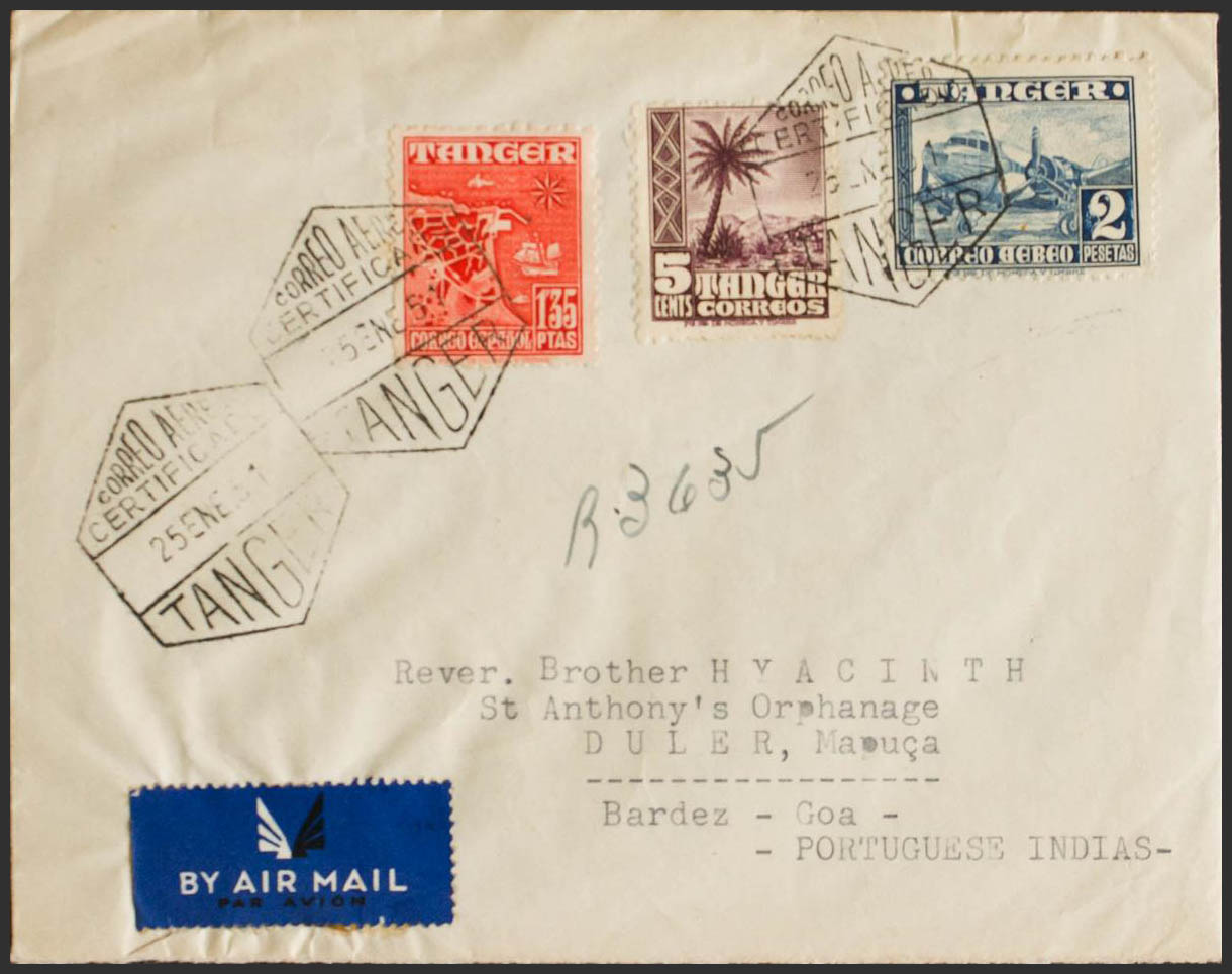 153, 162, 170. 1951. 5 lilac cts, 1´35 red sts and 2 teal blue sts. Airmail from TANGIER to BARDEZ (PORTUGUESE INDIA). On the back arrival. MAGNIFICENT AND VERY RARE DESTINATION.