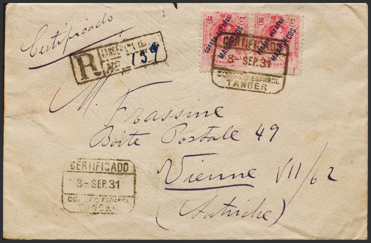 7(2). 1931. 40 rose cts, pair. Certificate from TANGIER to VIENNA (AUSTRIA). On the back arrival. MAGNIFICENT AND UNUSUAL ORIGIN AND DESTINATION.
