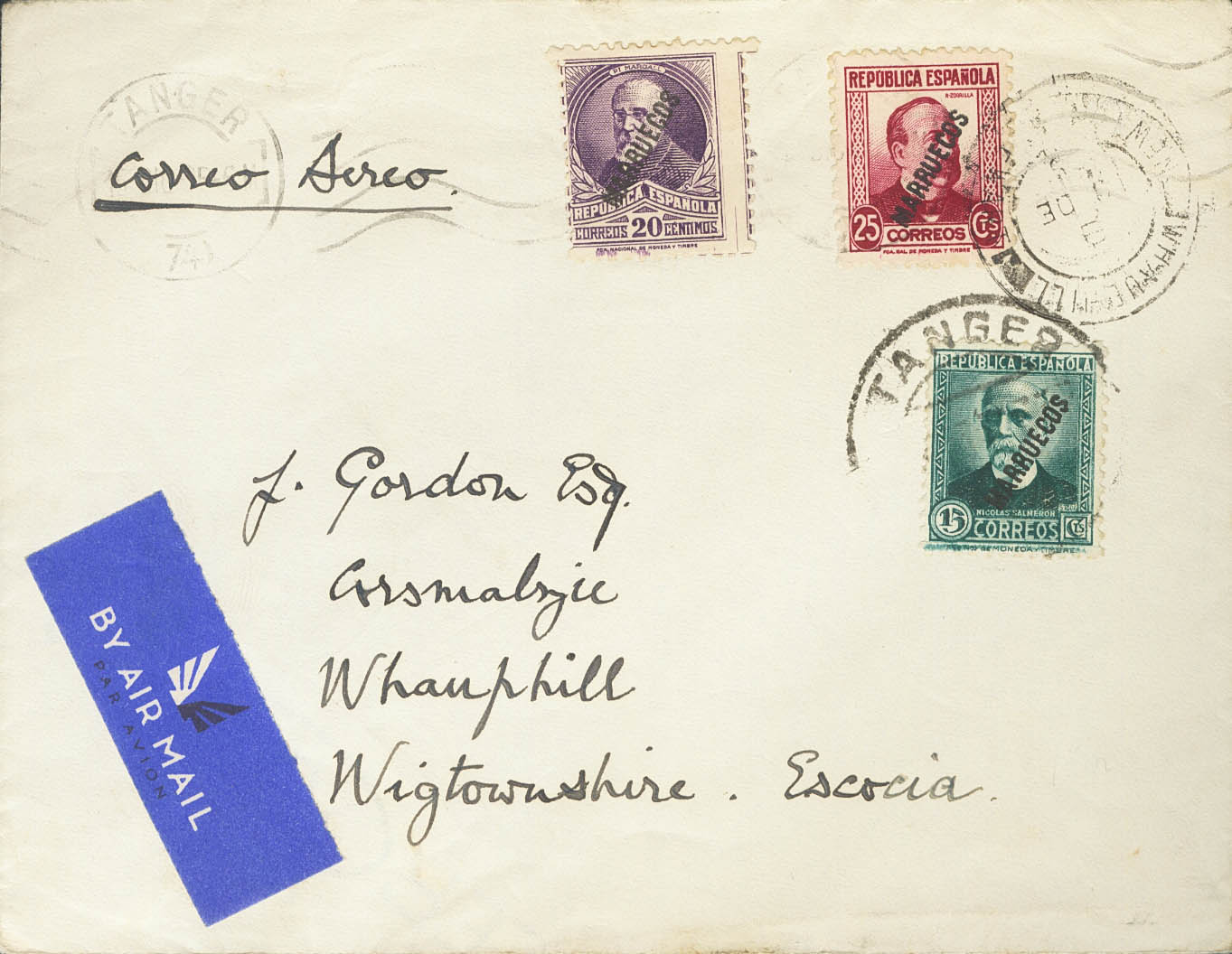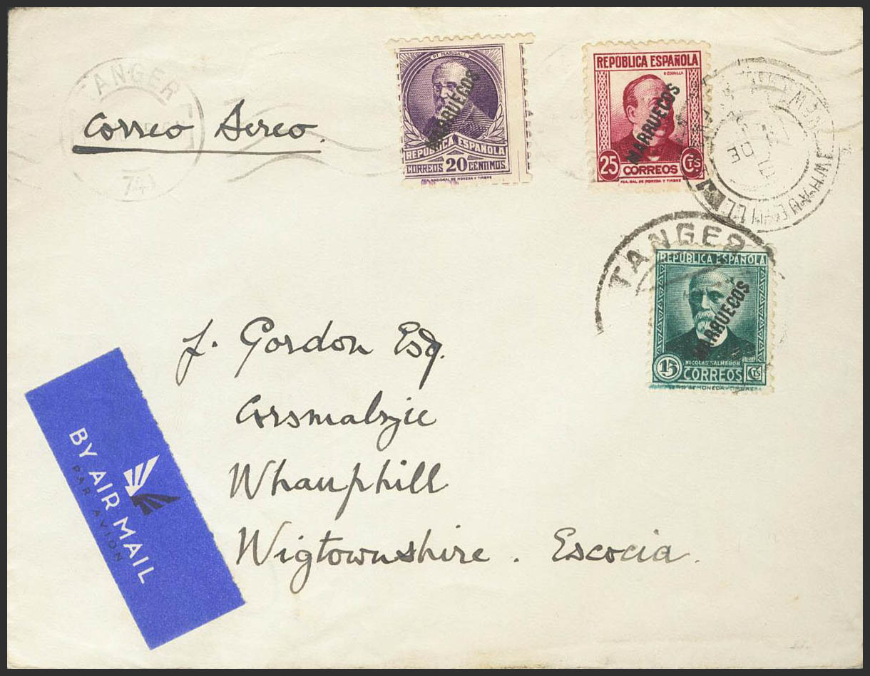 English 74/76. 1935. 15 cts green, 20 cts violet and 25 cts carmine. TANGIER to WHAUPHILL (GREAT BRITAIN). On the back arrival. MAGNIFICENT.