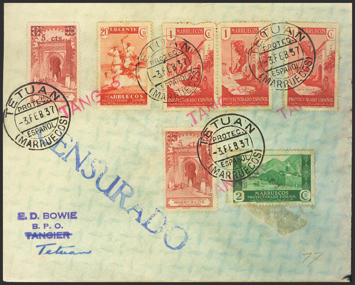 CN1, CN20(2). 1937. 1 cts red, three stamps, 2 cts green, 20 cts red, and 5 cts over 25 cts red, two stamps, all values marked TANGER by CORREO NACIONAL (on arrival). TANGIER to TETOUAN. BEAUTIFUL AND RARE, THE VALUES OF 1 CTS AND 20 CTS ARE NOT LISTED.