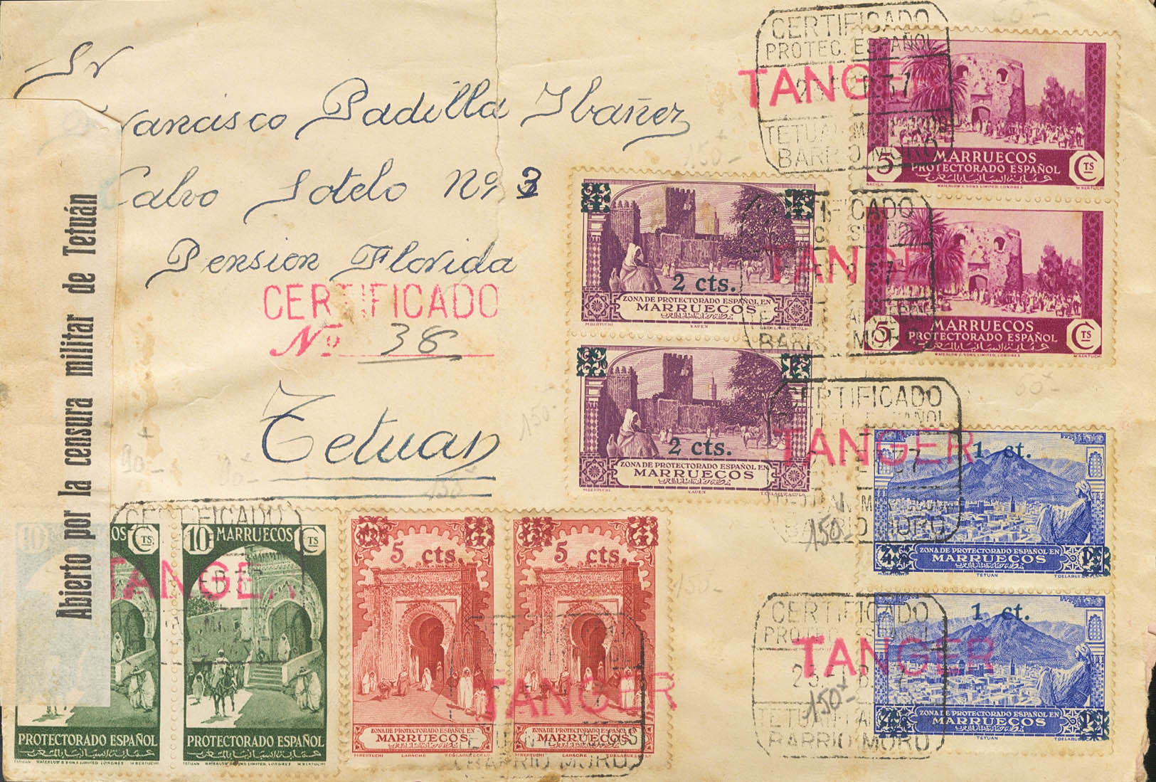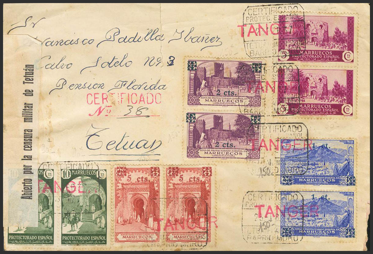CN2(2), CN3(2), CN18/20(2). 1937. Various values (toned), all values with the TANGER mark of the NATIONAL POST (on arrival). Certificate from TANGIER to TETUAN. BEAUTIFUL AND RARE POSTAGE.