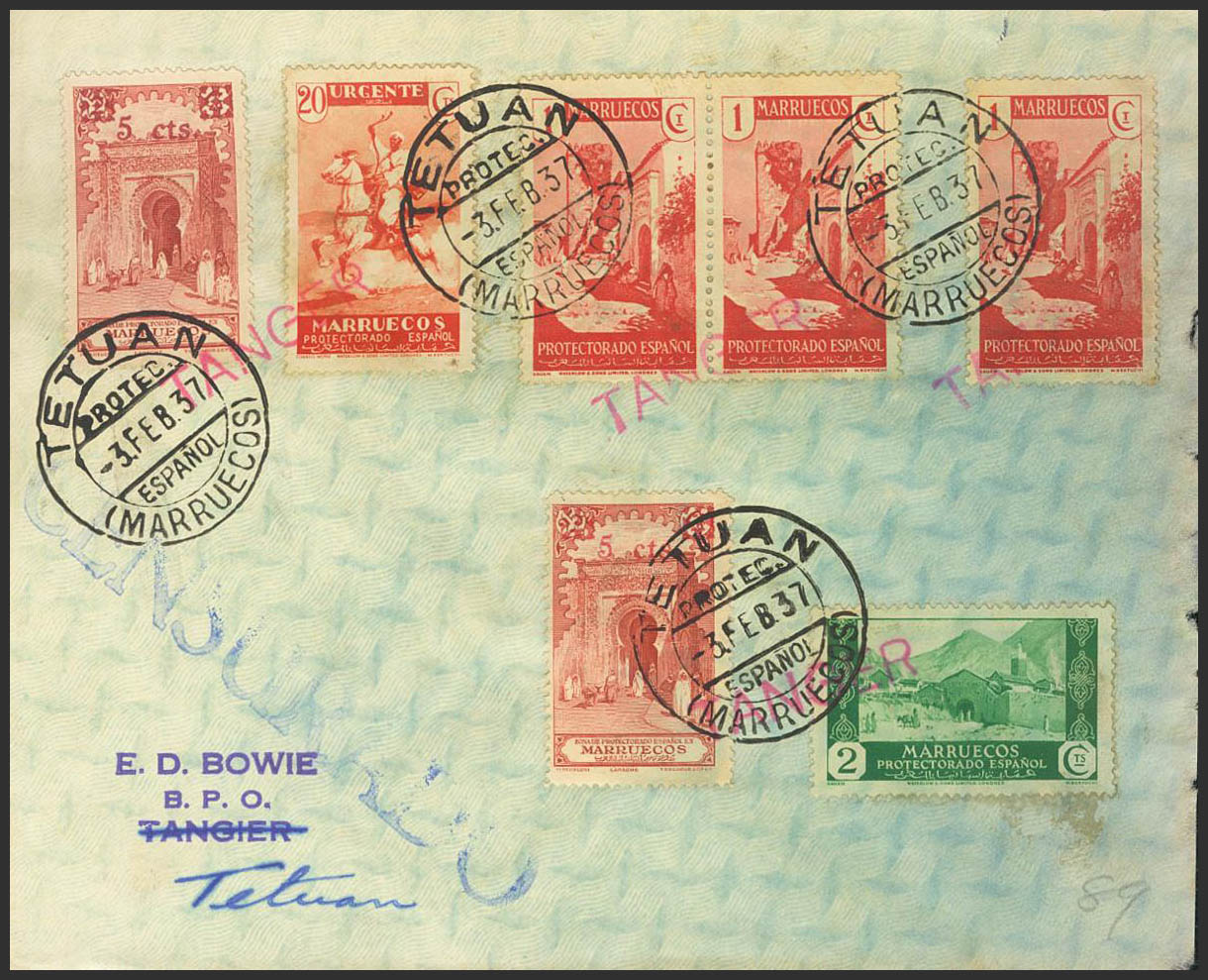 CN1, CN20(2). 1937. 1 cts red, three stamps, 2 cts green, 20 cts red and 5 cts over 25 cts red, two stamps, all values ​​with the TANGER mark of the NATIONAL MAIL (on arrival). TANGER to TETOUAN. BEAUTIFUL AND RARE, THE VALUES OF 1 CTS AND 20 CTS ARE NOT REVIEWED.