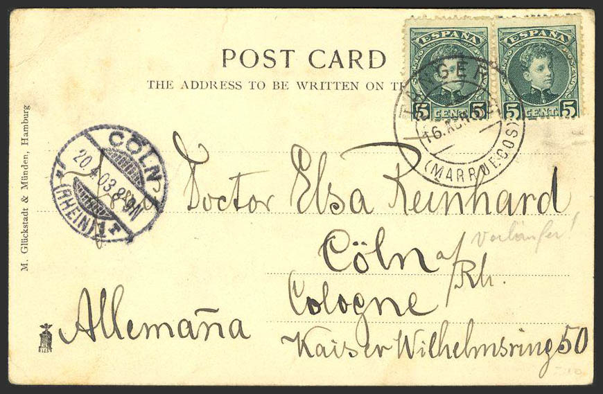 242(2). 1908. 5 cts. green, two seals. Post card from TANGIER to COLOGNE (GERMANY). Postmark TANGER / (MOROCCO). MAGNIFICENT AND RARE USE OF SPANISH STAMPS IN MOROCCO.