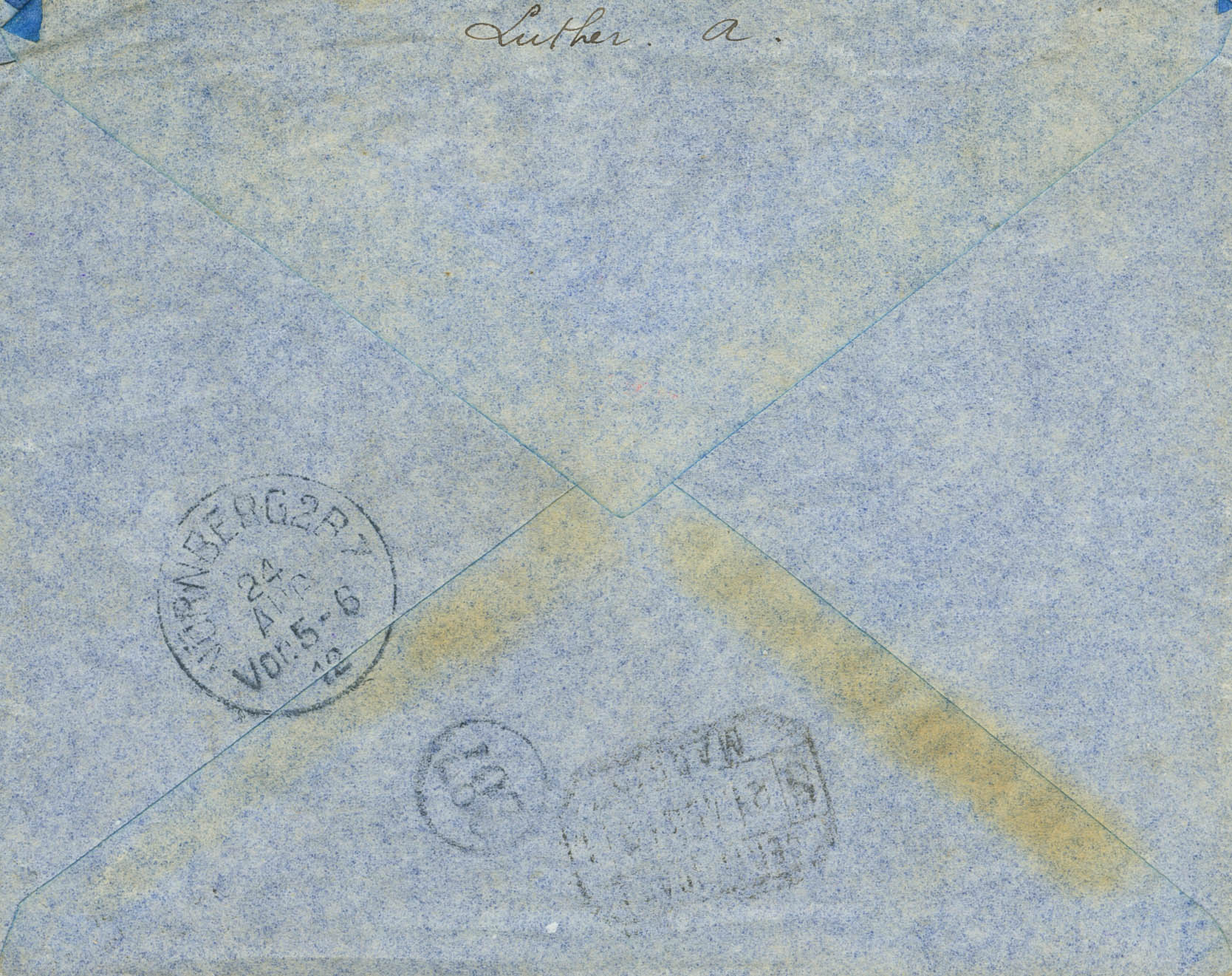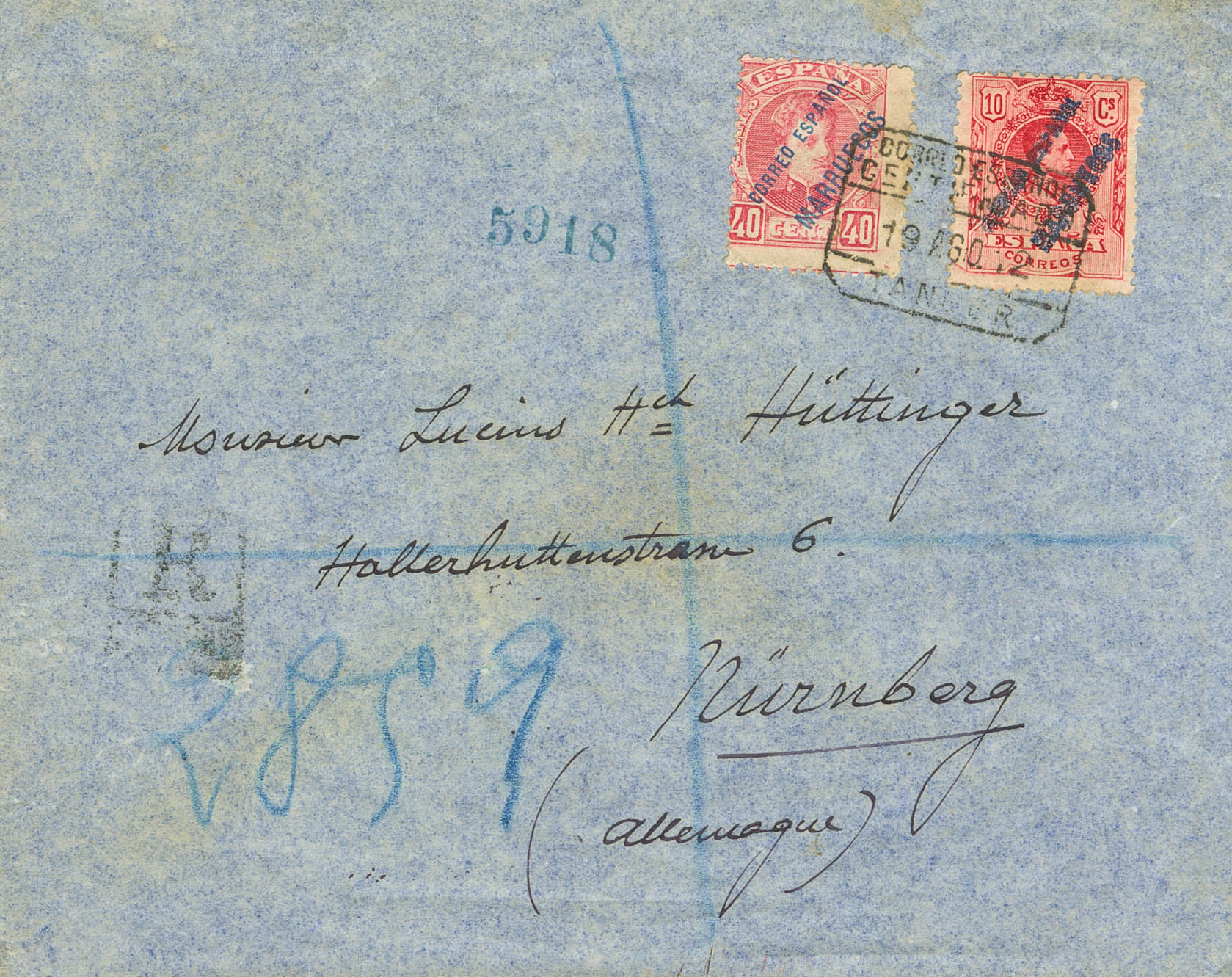 |ENVELOPE| 3, Morocco 9. 1912. 10 cts red and 40 cts pink from Morocco. Certificate from TANGER to NUREMBERG (GERMANY). Arrival on the back. MAGNIFICENT AND RARE COMBINATION OF POSTAGE.