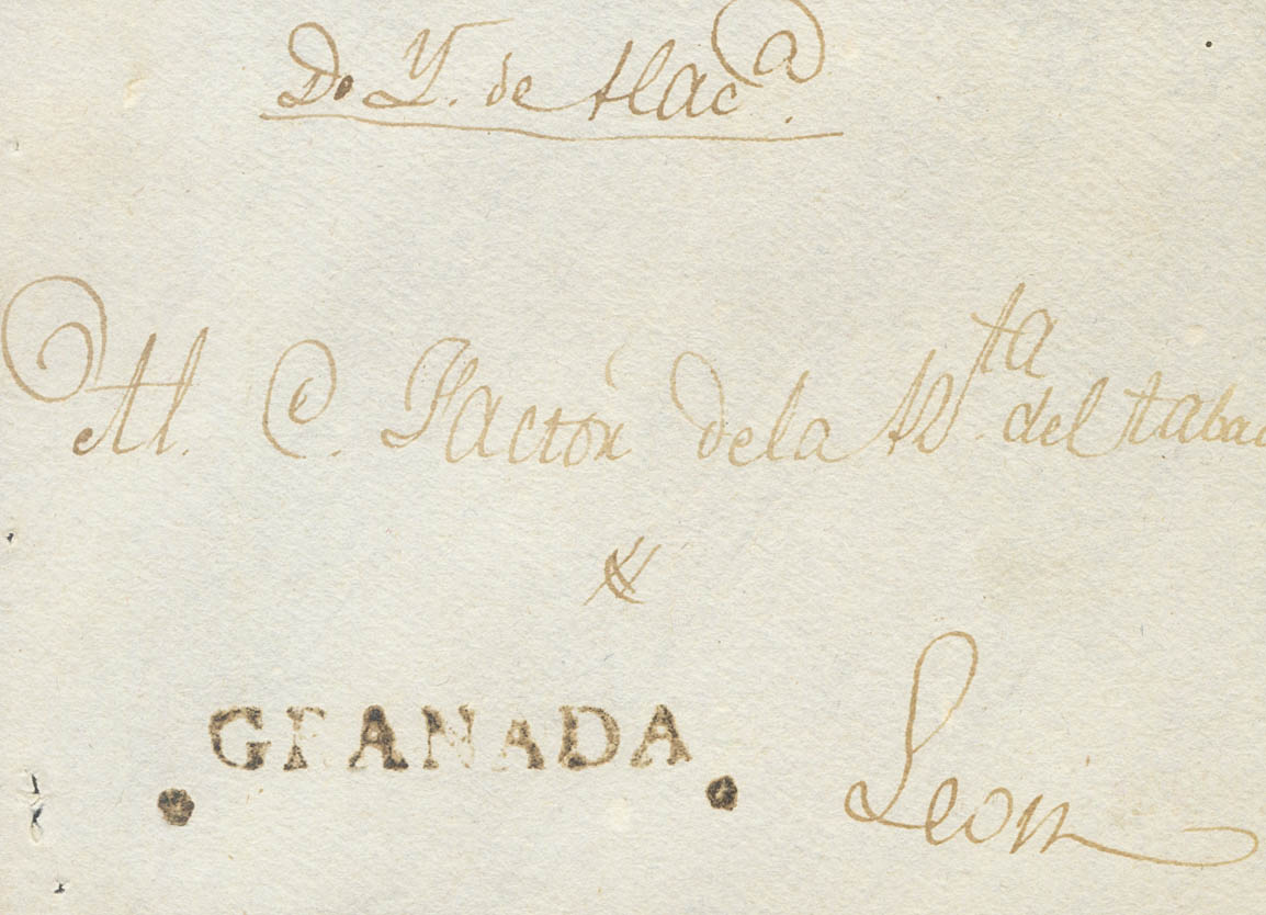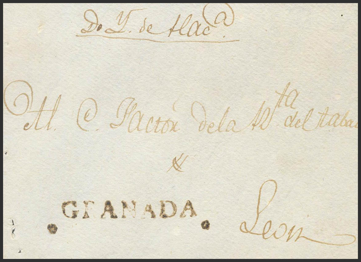 1821. Front from GRANADA to LEON. Brand *GRANADA*, in our opinion its stamping occurred during the Spanish colonial period in America (PE2) edition 2004. MAGNIFICENT AND VERY RARE.