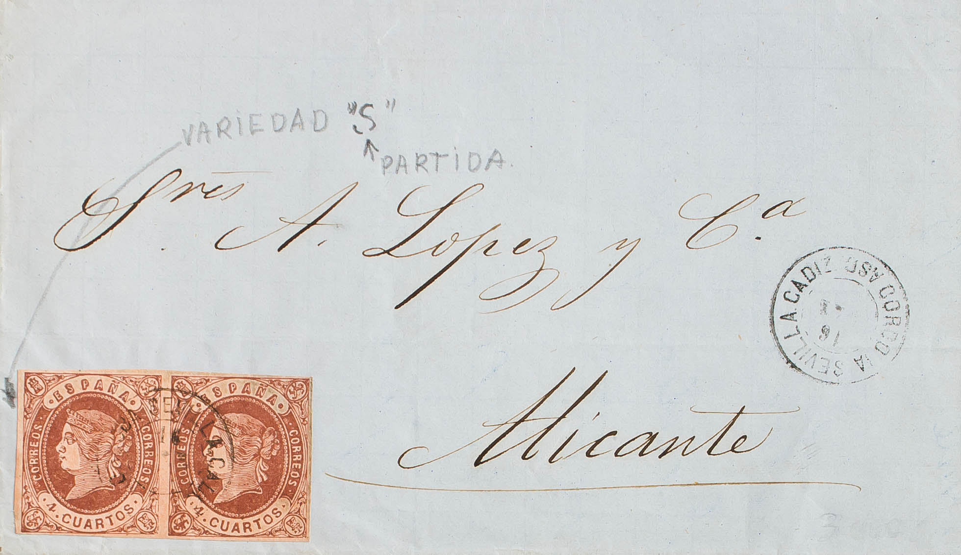 58(2). 1863. 4 cuartos chestnut, pair. CADIZ to ALICANTE. Postmark CORDOBA.SEVILLA.CADIZ / ASC. MAGNIFICENT AND RARE, ESPECIALLY A DOUBLE PORT.