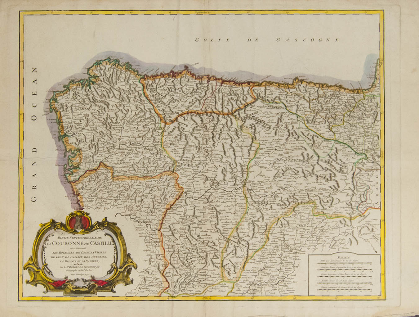 English 1752. NORTHERN PARTIE DE LA COURONNE DE CASTILLE OR SE TROUVENT LES ROYAUMES DE CASTILLE VIEILLE DE LEON, DE GALLICE, DES ASTURIES, LA BISCAYE ET LA NAVARRE. Robert deVaugondy. Paris, 1752. MAGNIFICENT AND VERY RARE, IDEAL FOR THE STUDY OF THE POSTAL HISTORY OF THIS REGION.