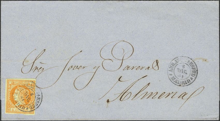 52. 1860. 4 cuartos yellow. MADRID to ALMERIA. Postmark AMB.DESC.2ª ESPED / *MADRID*. MAGNIFICENT.