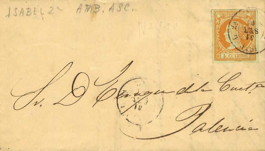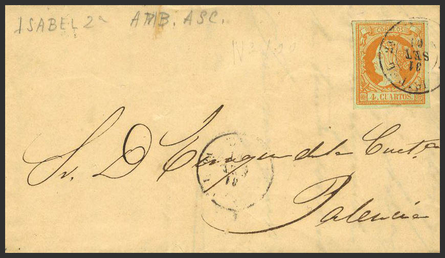 English 52. 1861. 4 cuartos yellow. CALATAYUD to PALENCIA. Postmark ISABEL 2ª / AMB.ASC. BARELY READABLE.