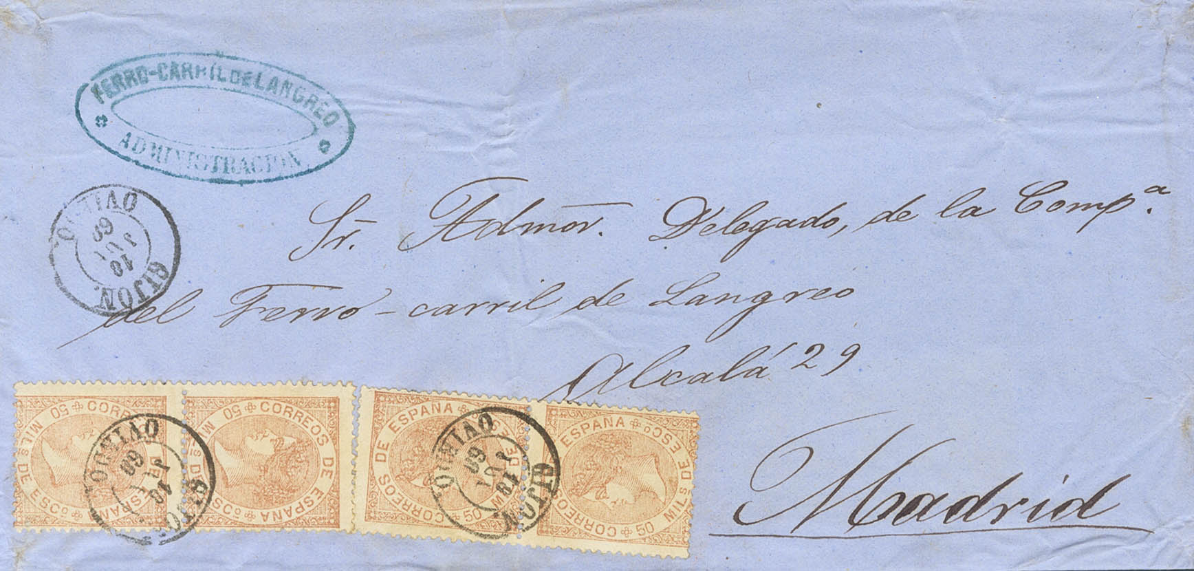 96(4). 1868. 50 mils yellow chestnut, four stamps. GIJON to MADRID. Postmark GIJON / OVIEDO and on the front it marks FERRO-CARRIL DE LANGREO / ADMINISTRATION, in blue. MAGNIFICENT AND RARE FOUR POST POSTAGE.