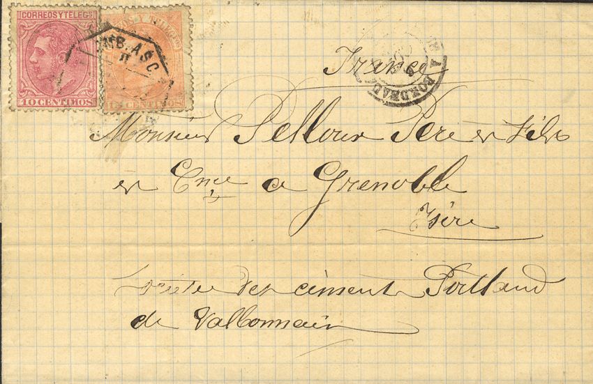202, 210. 1883. 10 cts pink and 15 cts orange. MALAGA to GRENOBLE (FRANCE). MAGNIFICENT AND UNUSUAL COMBINATION TO COMPOSE THE RATE OF 25 CTS.