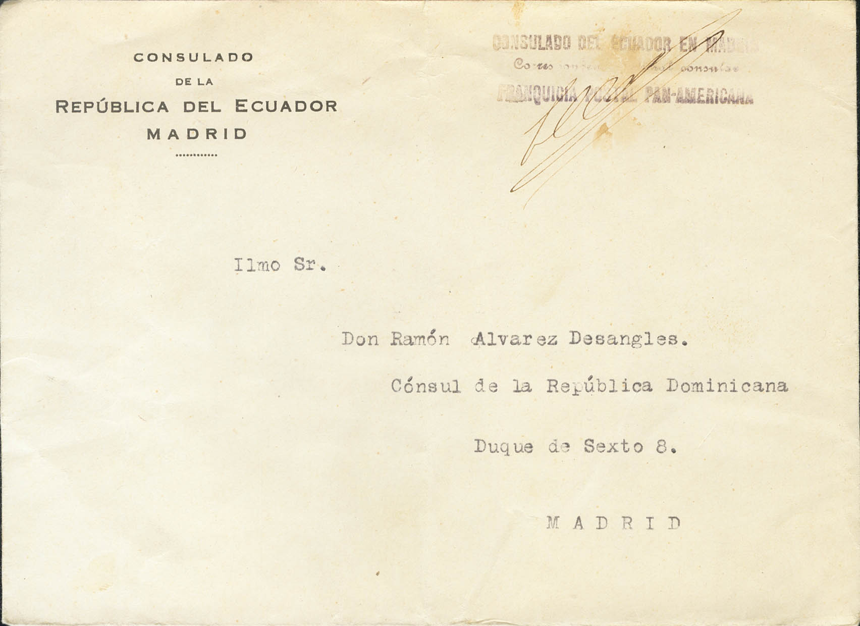 (1939ca). MADRID Interior Mail. Brand CONSULATE OF ECUADOR IN MADRID / PAN AMERICAN POSTAL FRANCHISE, in purple. MAGNIFICENT.