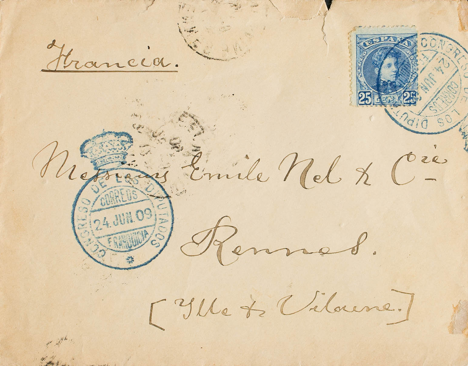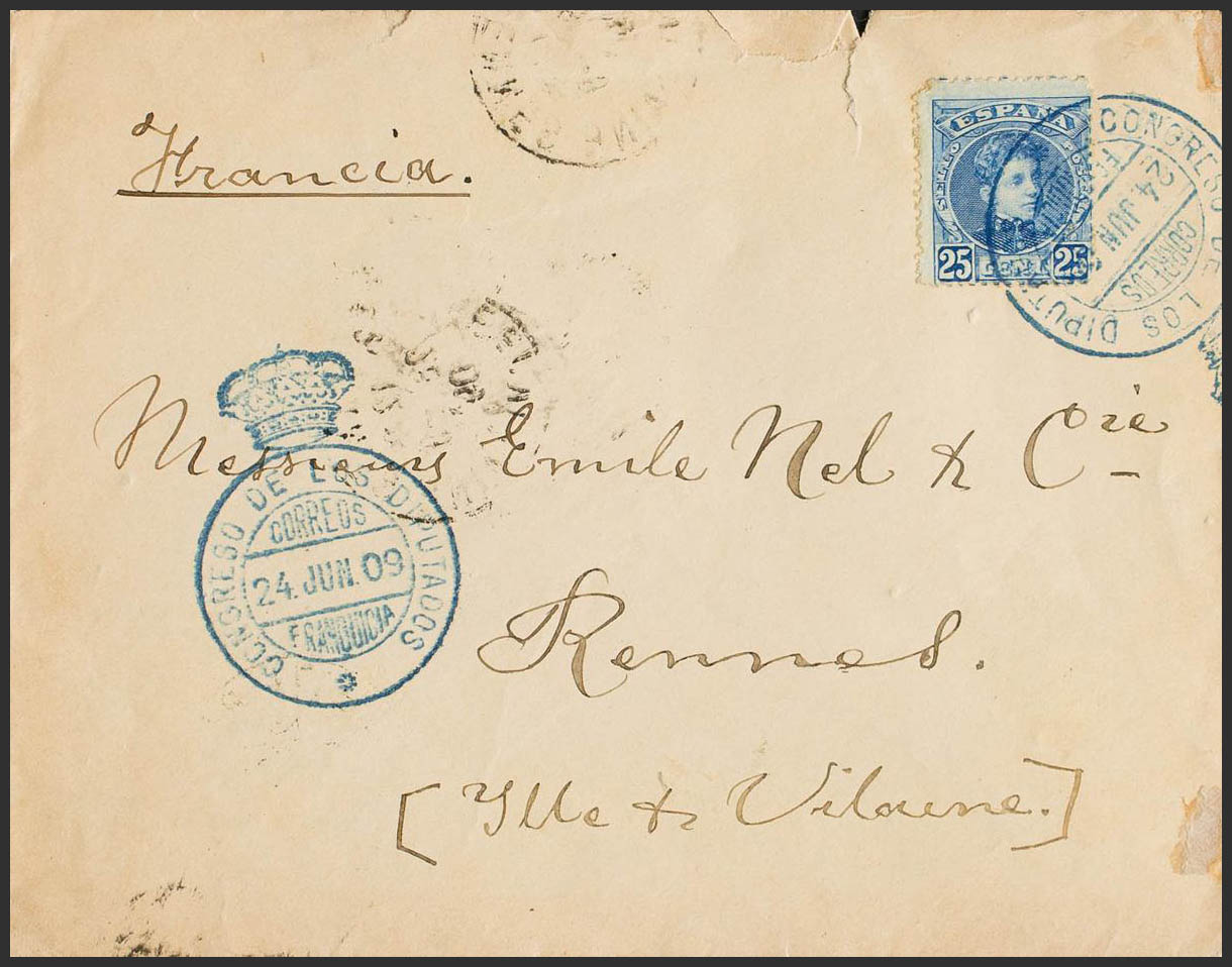 248. 1909. 25 cts blue. MADRID to RENNES (FRANCE). Postmark CONGRESS OF DEPUTIES / CORREOS / FRANCHISE, in blue and arrival on the back. PRETTY.