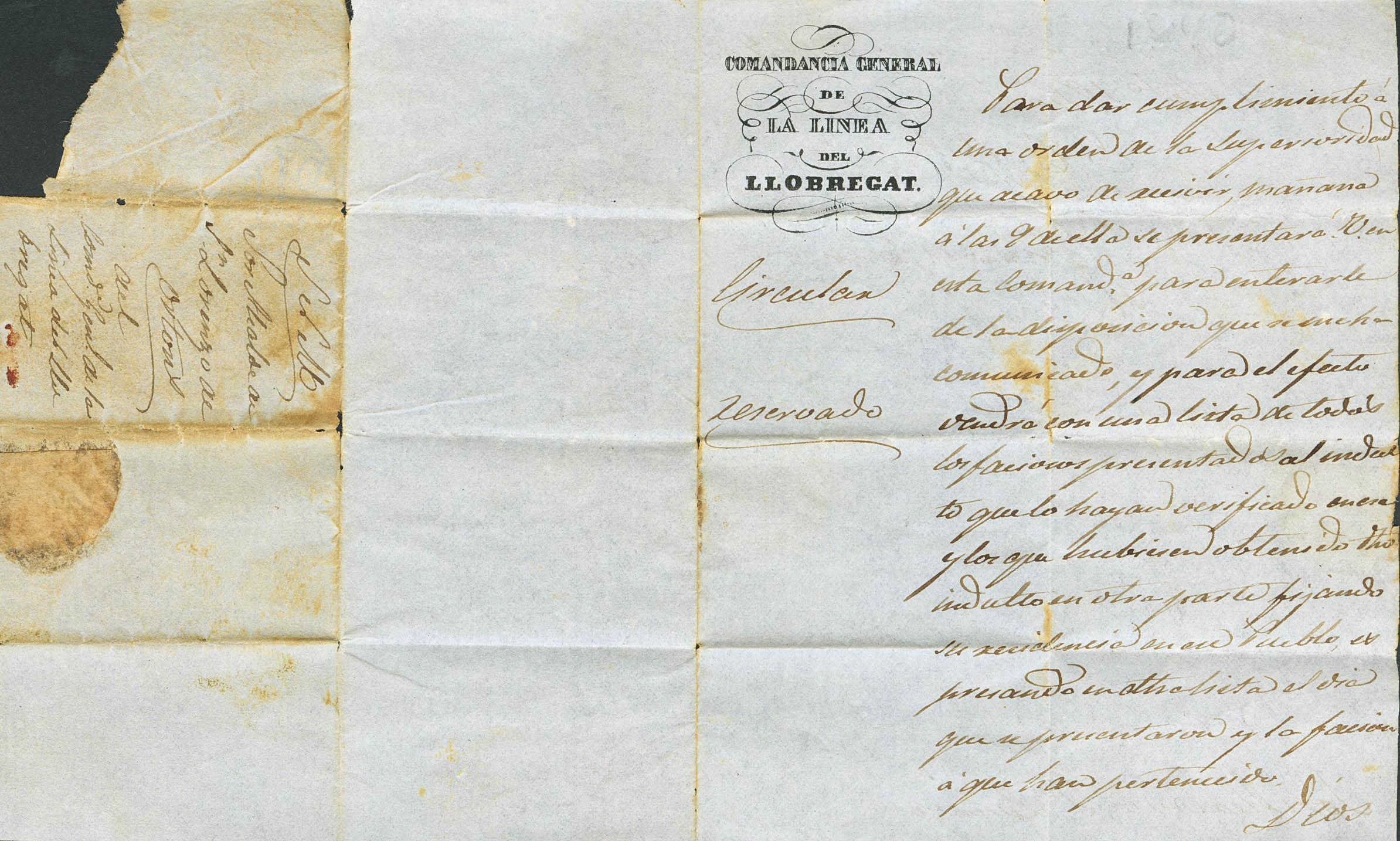 1840. ESPARRAGUERA (BARCELONA) to SAN LORENZO DE ORTONS (BARCELONA). Circulated through the National Military Service, inside the letterhead of the General Command of La Linea del Llobregat. MAGNIFICENT AND VERY RARE, IT HAS THE CURIOSITY OF ITS SMALL SIZE, IT PROBABLY HAS THE HONOR OF BEING THE SMALLEST LETTER CIRCULATED BY THE SPANISH MAIL.