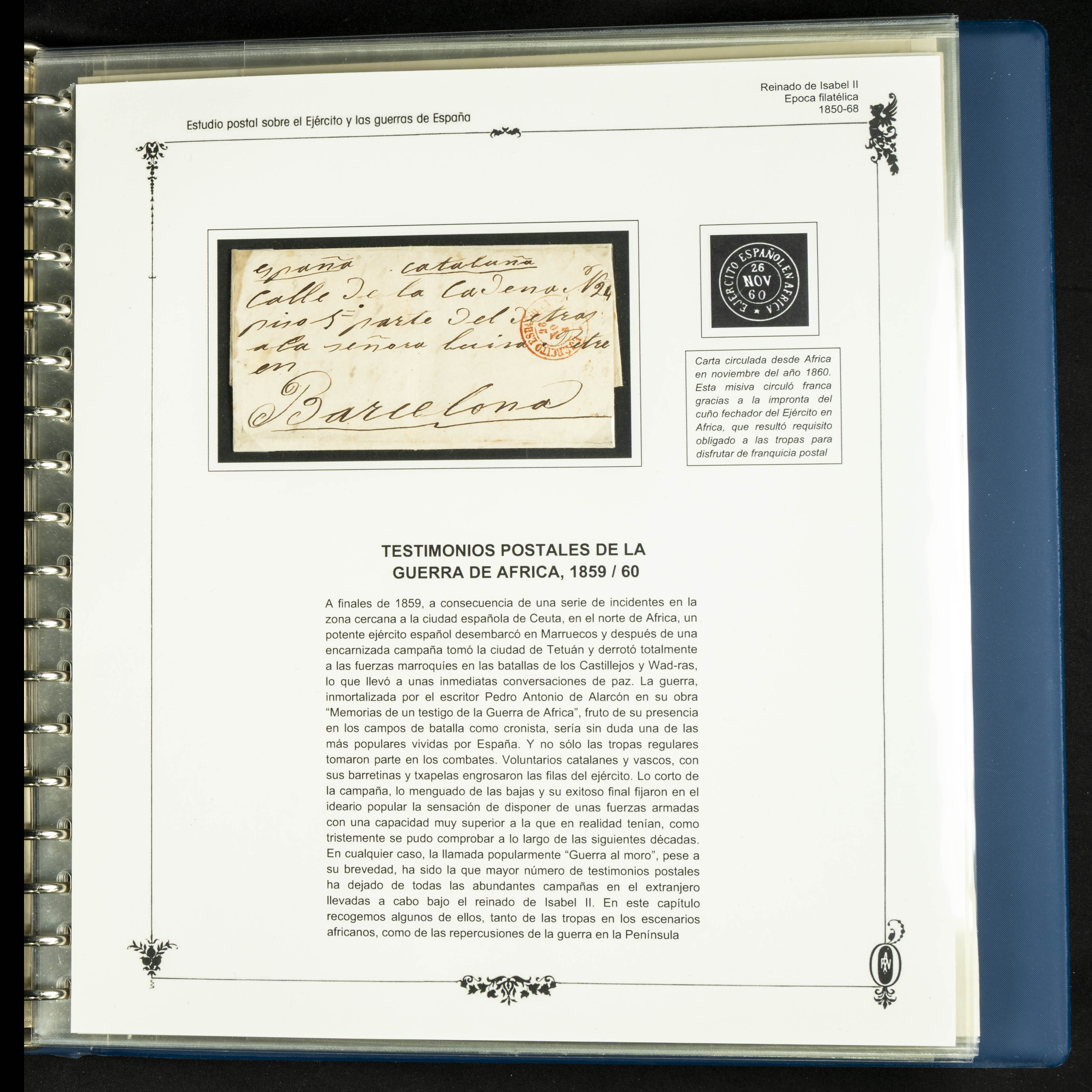 |ABOUT|1859. Very interesting set relating to the African War between 1858 and 1860, including three letters addressed to Madrid and Barcelona, one with the date stamp EJEGoodITO ESPAÑOL EN AFRICA in red, another with the mark on the back EGEGoodITO DE AFRICA / PRIMER CUERPO / EM in blue (the first time we have seen it) and another with a drawing of a soldier, a circular calling up reservists as well as data on replacements, telegrams and bulletins of the war, a letter franked with 2 reales of 1860 with the Hymn of the Basque Tercios, a franked letter originating in Barcelona and addressed to Tetouan and a letter franked with 4 cuartos of 1855 addressed to Malaga to a soldier. MAGNIFICENT AND EXTRAORDINARILY RARE SET.