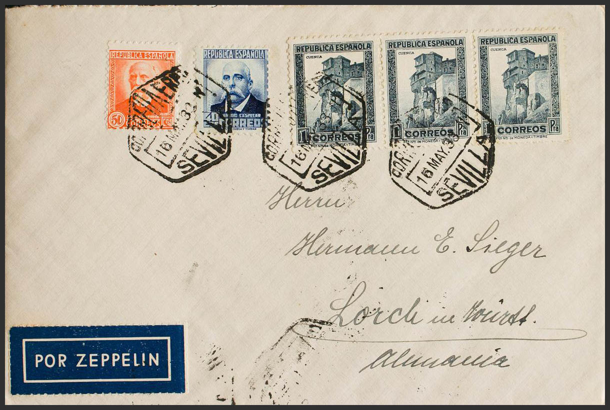 670, 671, 673(3). 1933. 40 blue cts, 50 orange cts and 1 slate pts, three stamps. Graf Zeppelin from SEVILLE to LORCH (GERMANY). Arrival mark on the back. MAGNIFICENT.