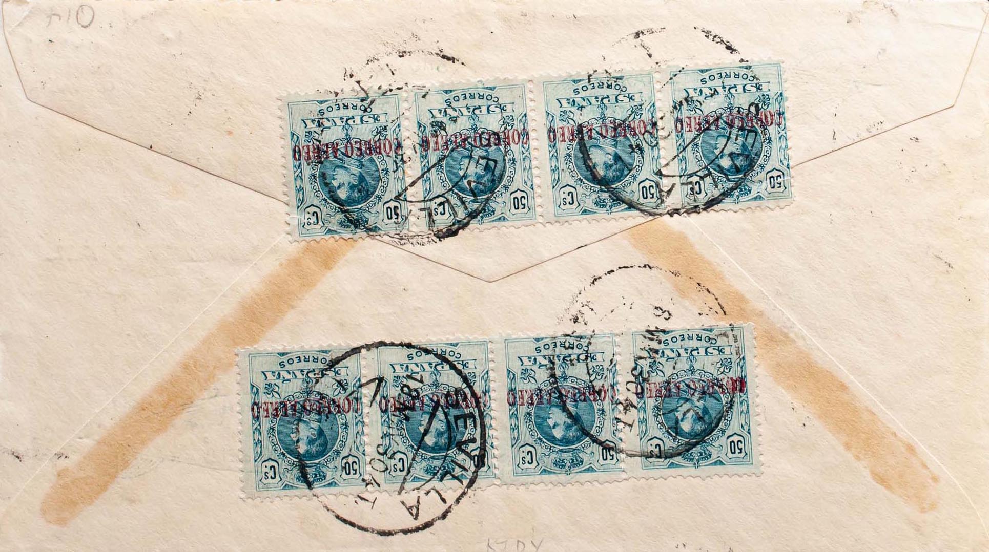 321/23, 295(8), 296. 1930. 1 pts, 4 pts, 10 pts, 50 cts greenish blue, eight stamps, on the back and 1 pts carmine. Graf Zeppelin from SEVILLE to SAN LUIS (USA). On the front it marks FIRST VOYAGE / GRAF ZEPPELIN / TO SOUTH AMERICA / SEVILLE 1930, in red and arrival mark to Lakehurst, in green. MAGNIFICENT.
