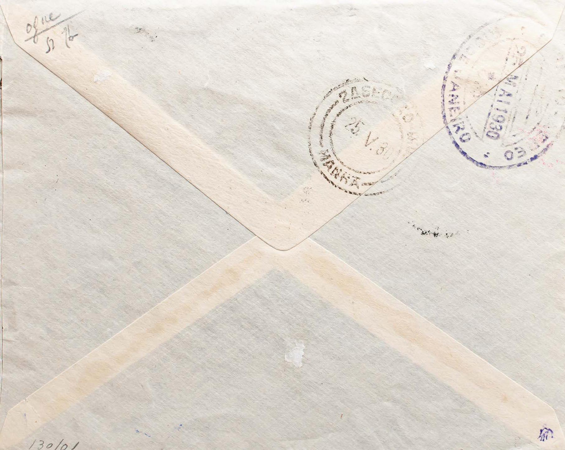 321(4), 322. 1930. 1 pts slate, four stamps and 4 pts violet carmine. Graf Zeppelin from SEVILLE to RIO DE JANEIRO (BRAZIL). On the front it marks FIRST VOYAGE / GRAF ZEPPELIN / TO SOUTH AMERICA / SEVILLE 1930, in red and on the back arrival. MAGNIFICENT.