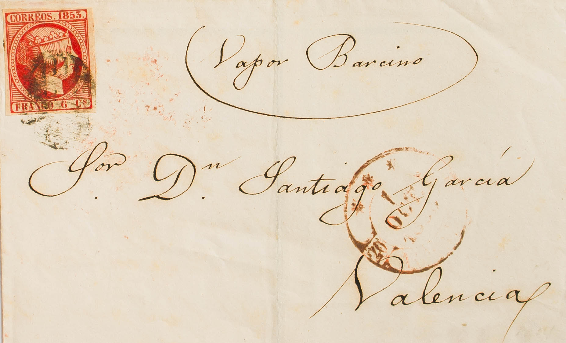 17. 1853. 6 cuartos pink. ALICANTE to VALENCIA. On the front handwritten "Vapor Barcino". MAGNIFICENT.