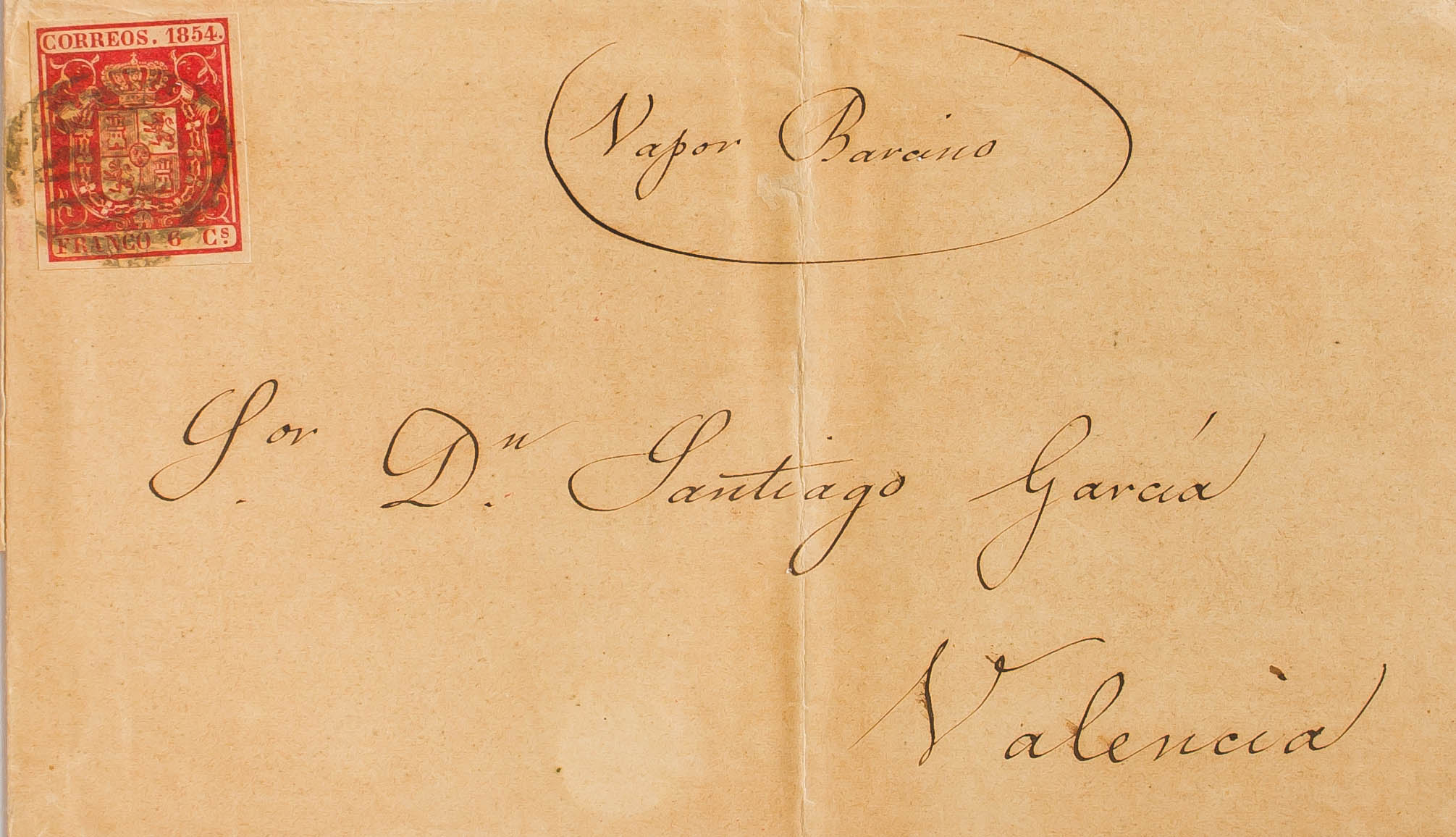 24. 1854. 6 carmine cuartos . ALICANTE to VALENCIA. On the front handwritten "Vapor Barcino". MAGNIFICENT.