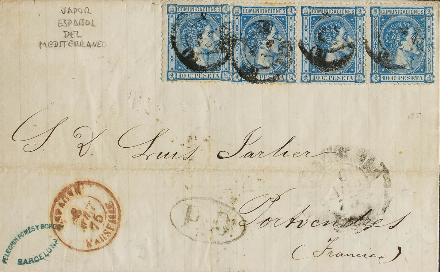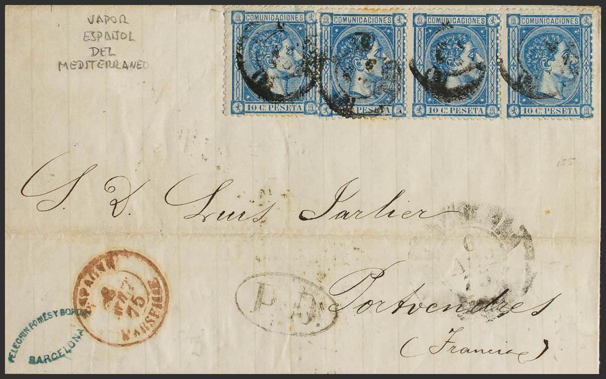 English 164(4). 1875. 10 blue cts, four stamps. BARCELONA to PORTVENDRES (FRANCE), circulated by steam via Marseille. MAGNIFICENT.