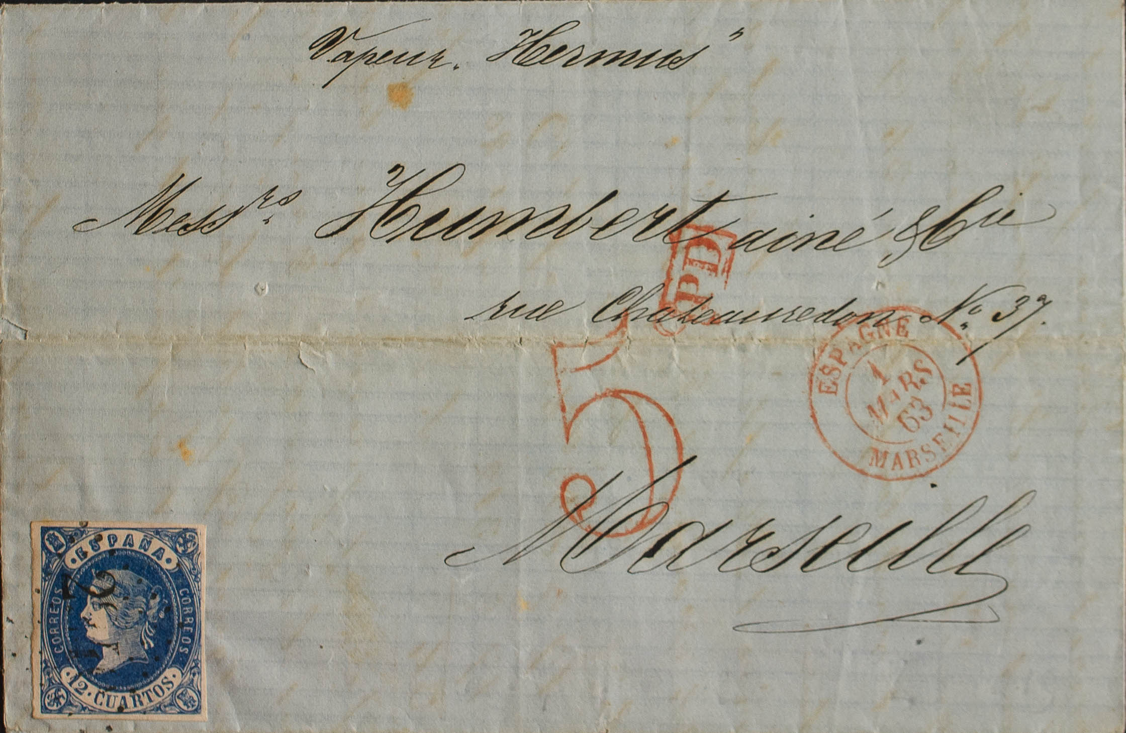 59. 1863. 12 cuartos blue. VALENCIA to MARSEILLE (FRANCE). RHOMBUS OF DOTS postmark Nº2240, from Marseille. MAGNIFICENT.