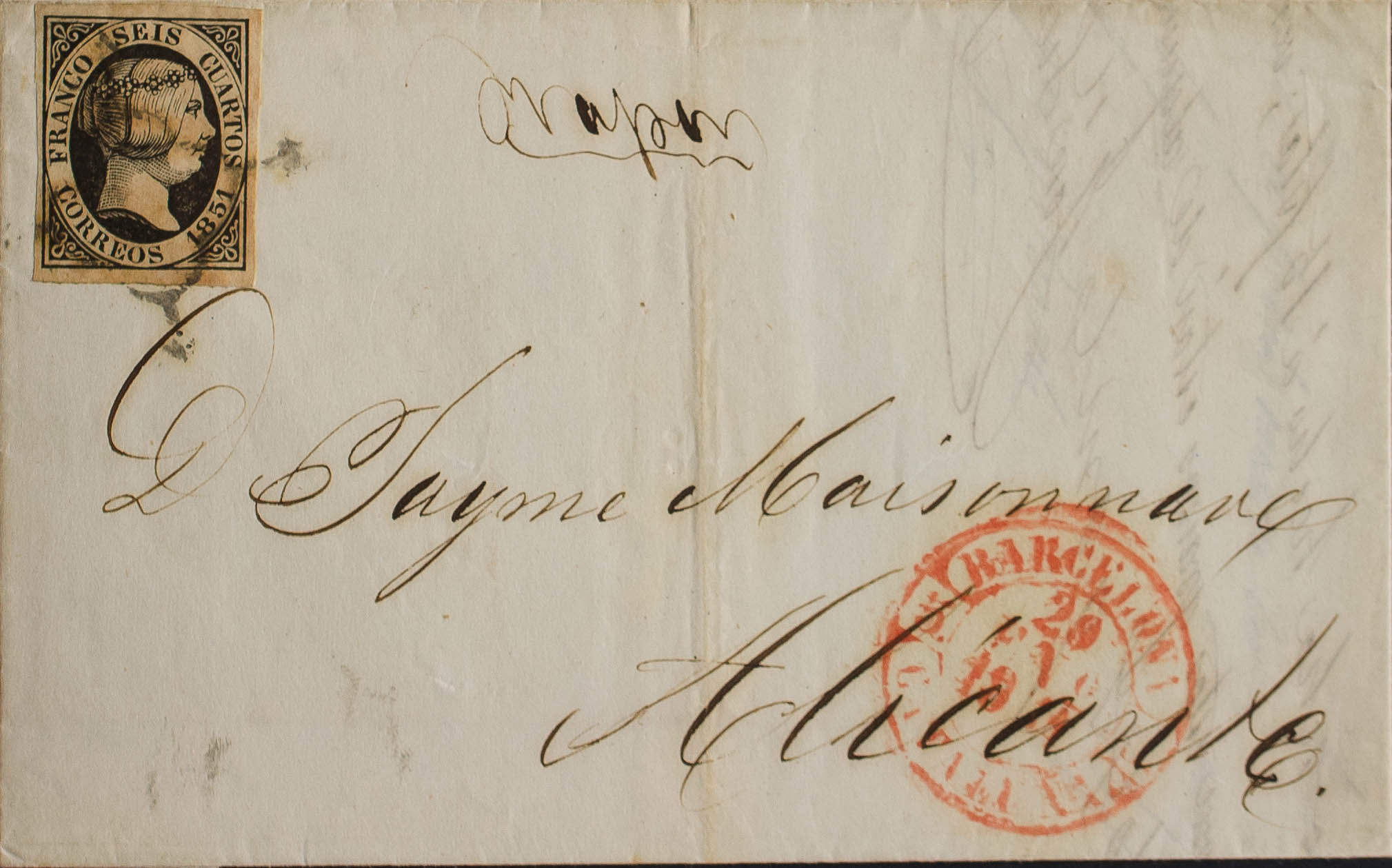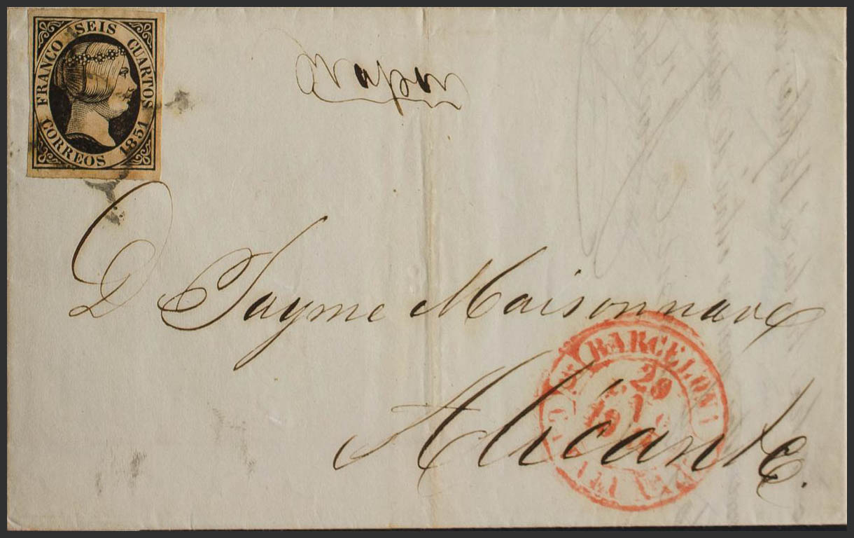 English 6. 1851. 6 cuartos black. BARCELONA to ALICANTE. On the front handwritten "Steam". MAGNIFICENT AND RARE.