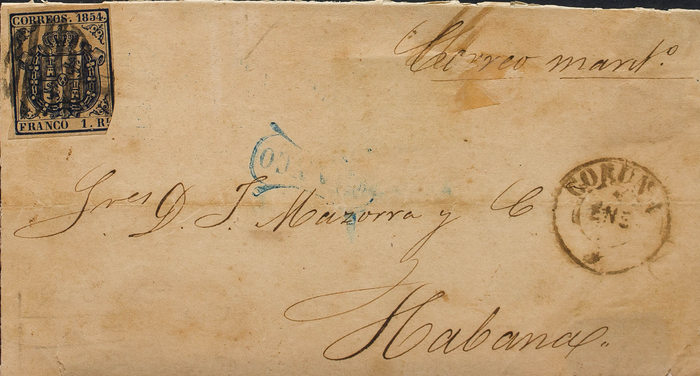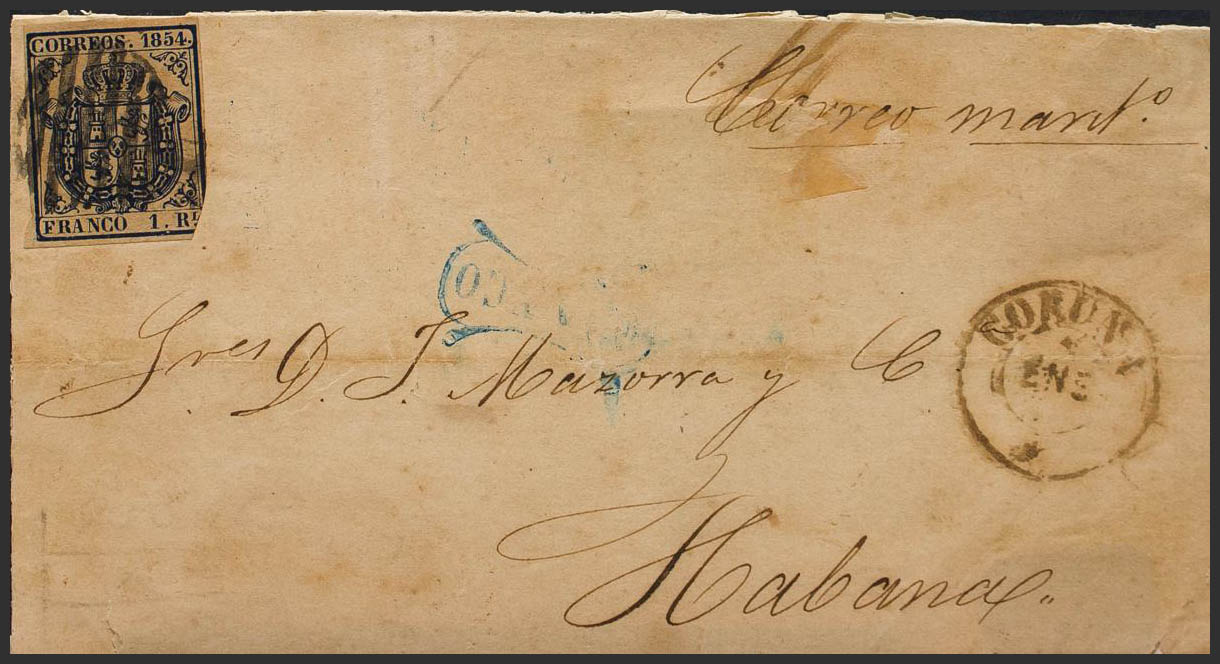 English 34. 1854. 1 real dark blue (just margin). Front from LA CORUÑA to HAVANA. On the front mark FRANCO, in blue for general use and handwritten "Correo Marítimo". BEAUTIFUL AND RARE.