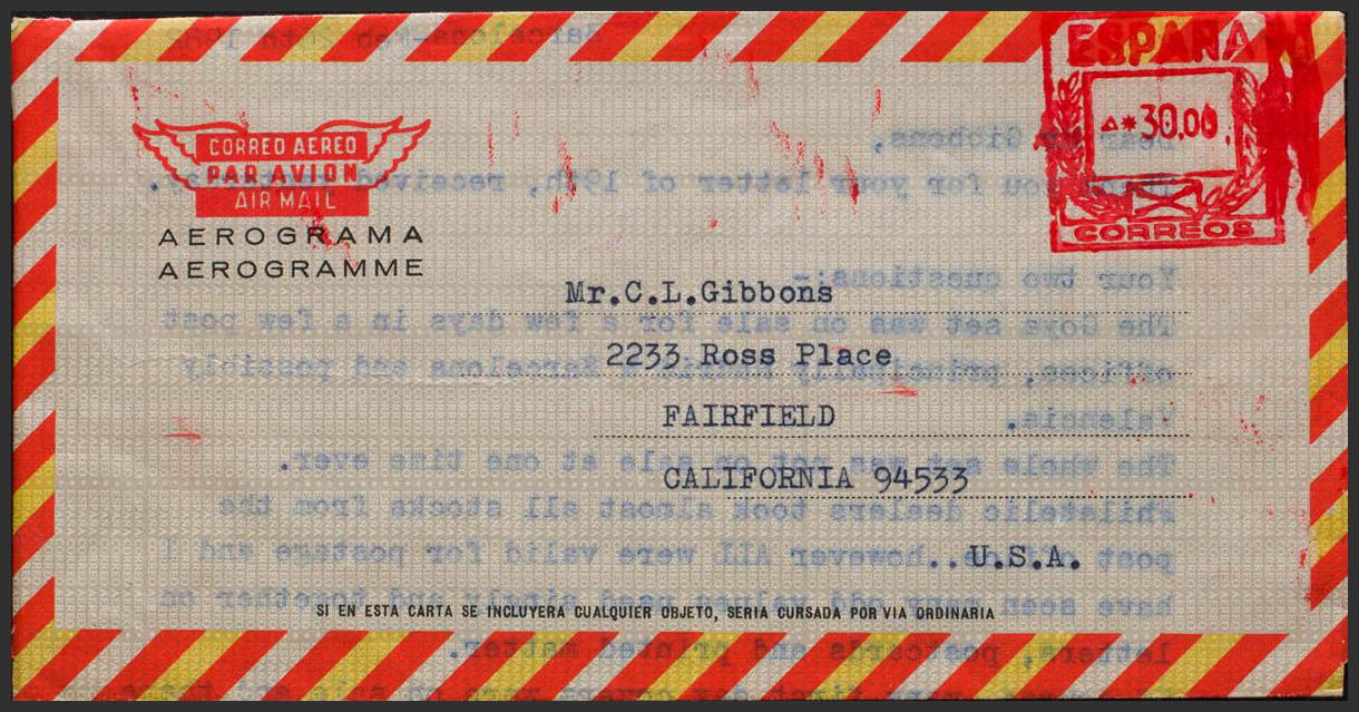 AE143. 1982. 30 pts on aerogram. BARCELONA to FAIRFIELD (USA). No postmark of origin or arrival. MAGNIFICENT.