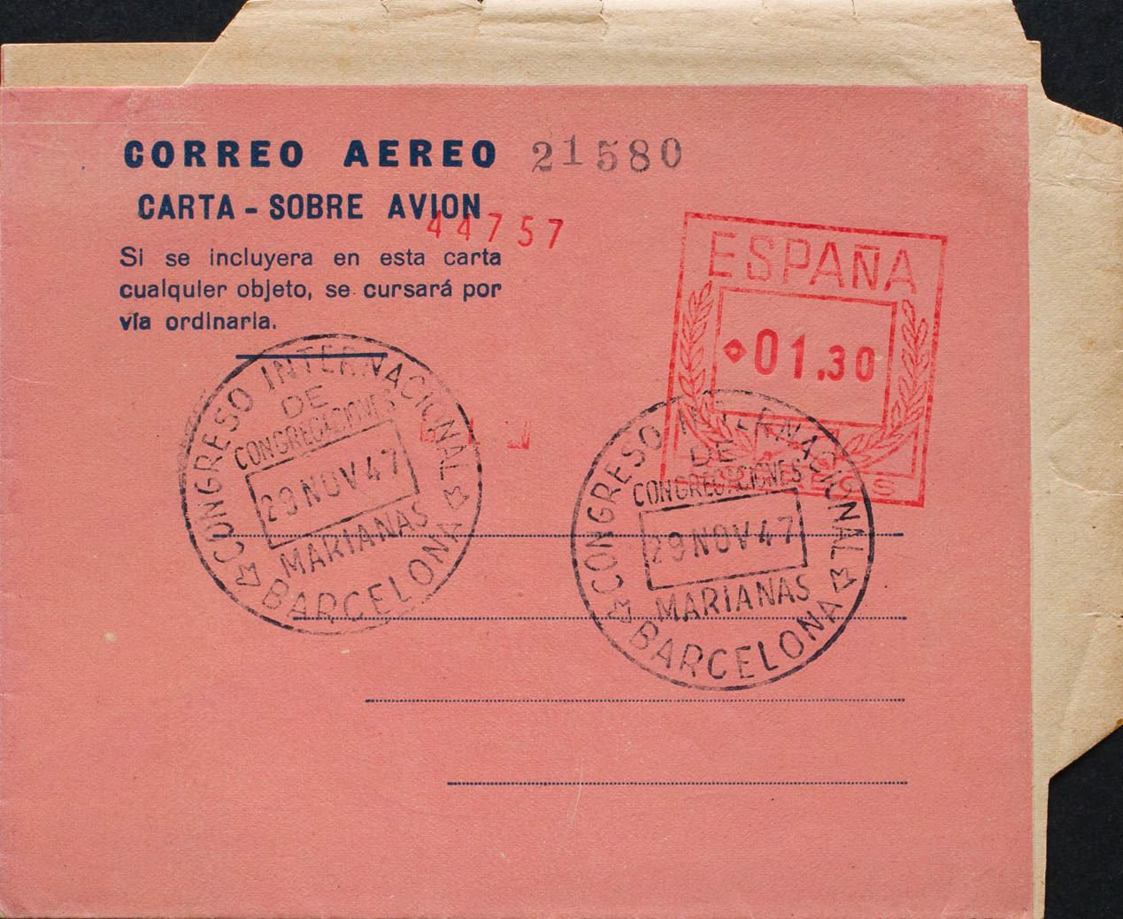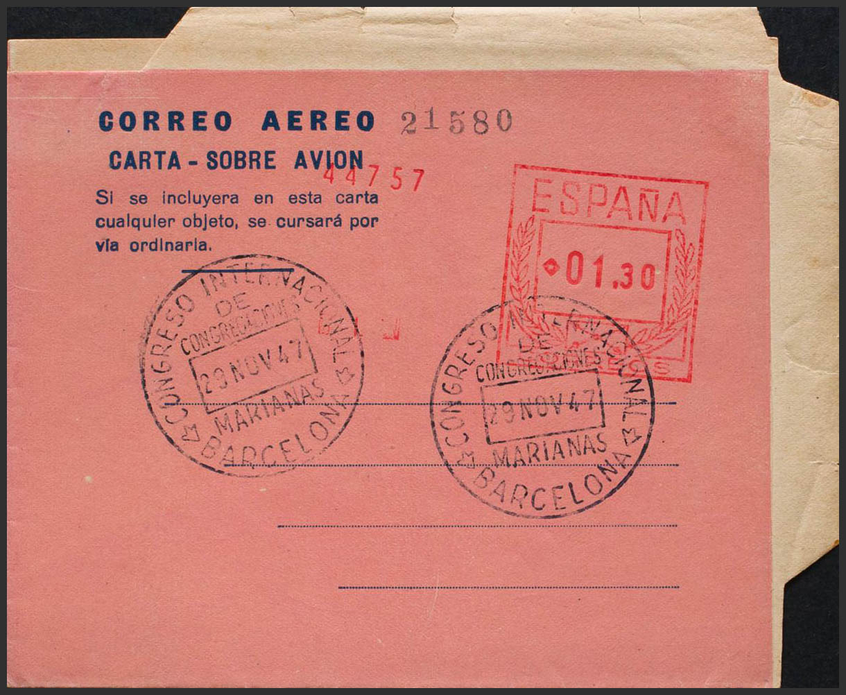 English AE2cch. 1947. 1´30 pts on aerogram (Type II). COLOR TRIAL, in pink. Postmark INTERNATIONAL CONGRESS / OF / CONGREGATIONS / MARIAN. MAGNIFICENT. (Laiz 2006, 90 Euros)