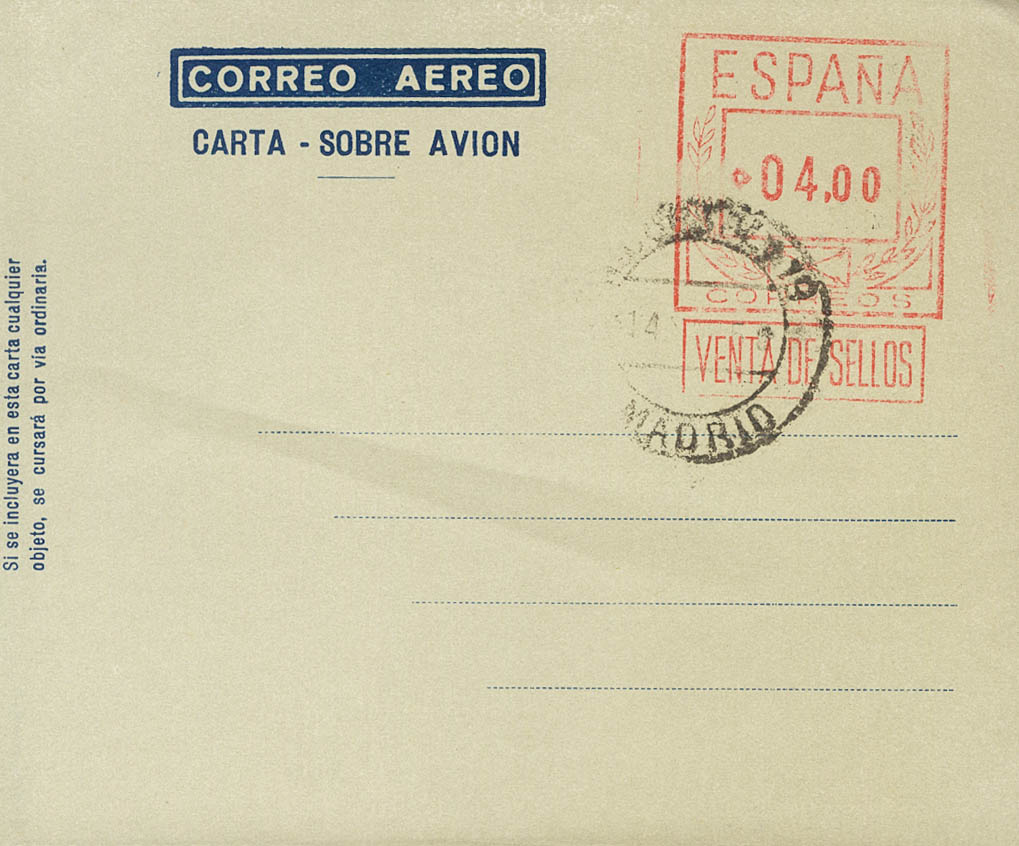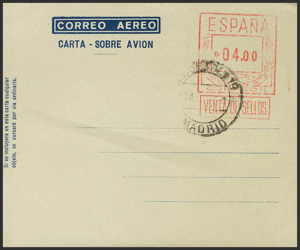 44G. 1948. 4 pts on greenish gray aerogram (Type I). Favor postmark. MAGNIFICENT. Edifil 2017: 187 Euros