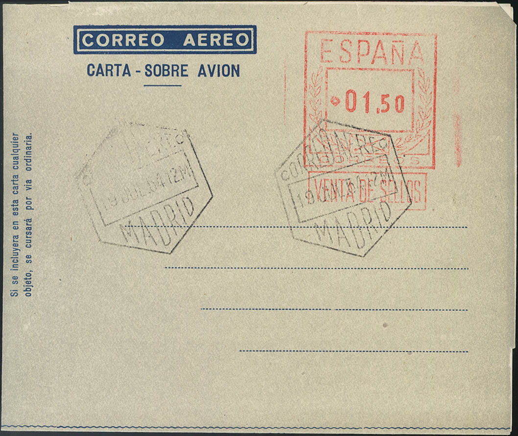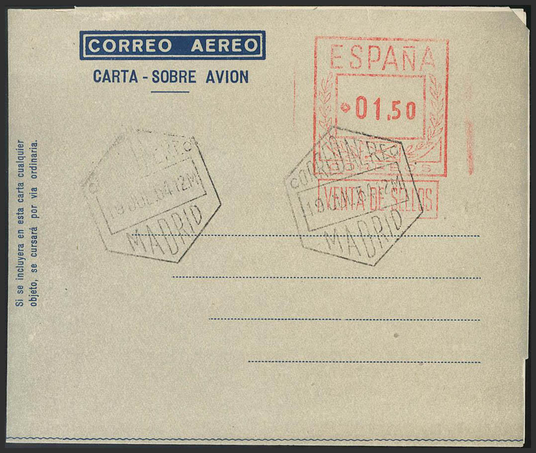 AE37. 1954. 1'50 pts on aerogram (Type I). Favor postmark. MAGNIFICENT. Edifil 2017: 135 Euros