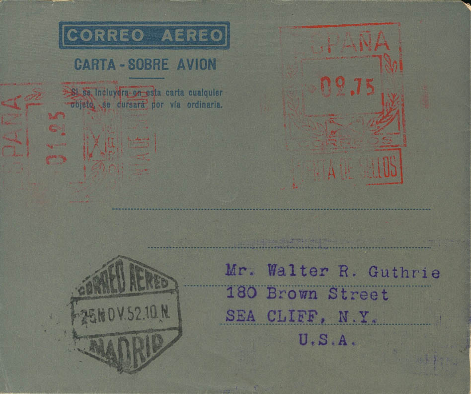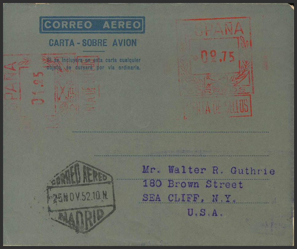 AE32. 1952. 2.75 pts + 1.25 pts on airgram with double postage. MADRID to NEW YORK (USA). MAGNIFICENT AND VERY RARE. Edifil 2017: 227 Euros