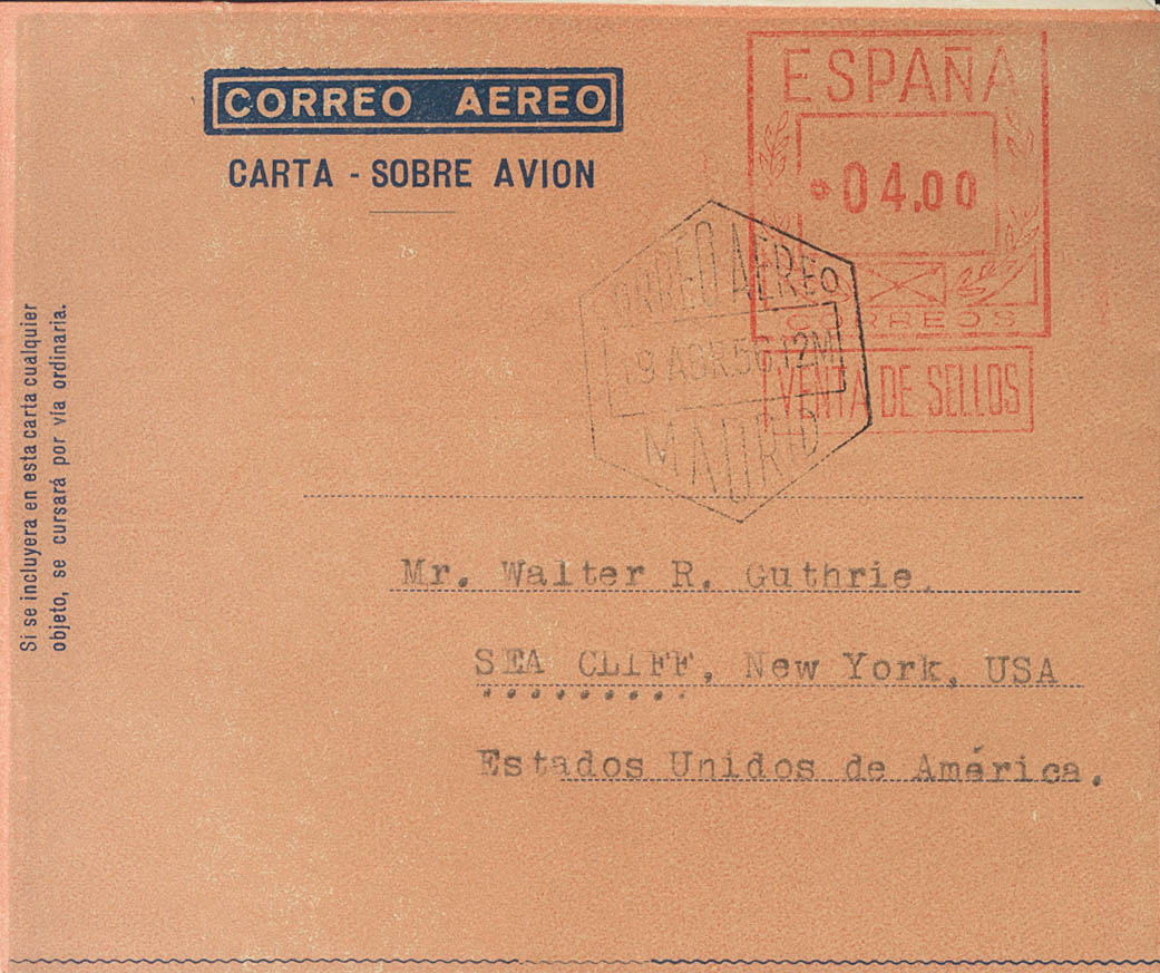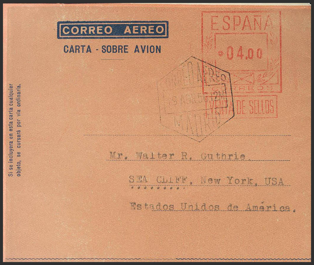 AE58ccb. 1956. 4 pts on aerogram. COLOR TEST, in salmon. MADRID to NEW YORK (USA). MAGNIFICENT.
