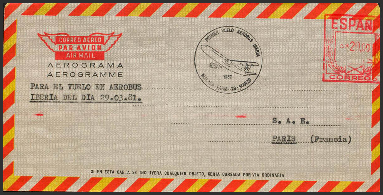 English AE141. 1981. 20 pts on aerogram. BARCELONA to PARIS (FRANCE). On the front postmark FIRST FLIGHT AEROBUS IBERIA, arrival on the back. MAGNIFICENT AND RARE.