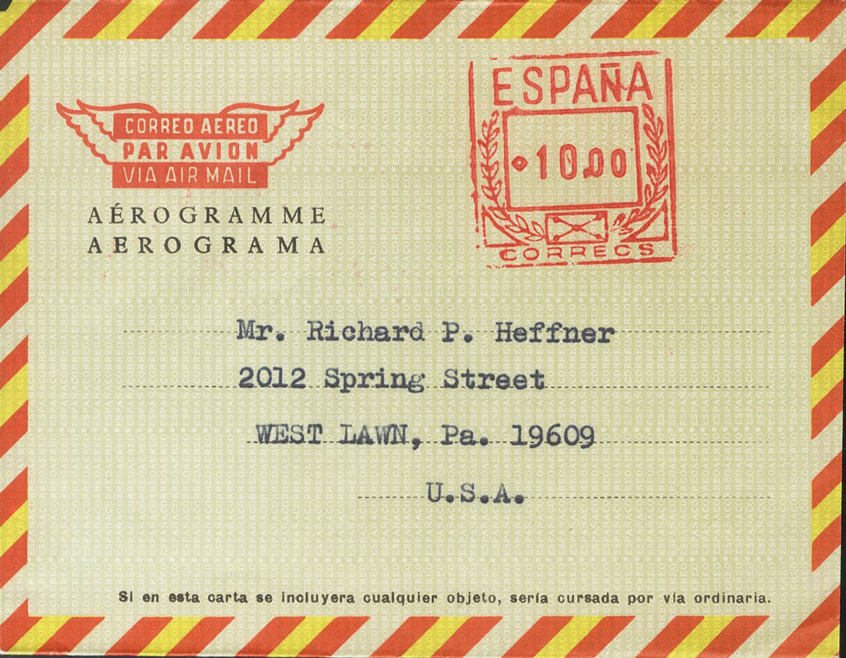 (★) AE104. 1967. 10 pts on aerogram (Type III without price). With the address registered but not circulated. MAGNIFICENT. Edifil 2017: 52 Euros